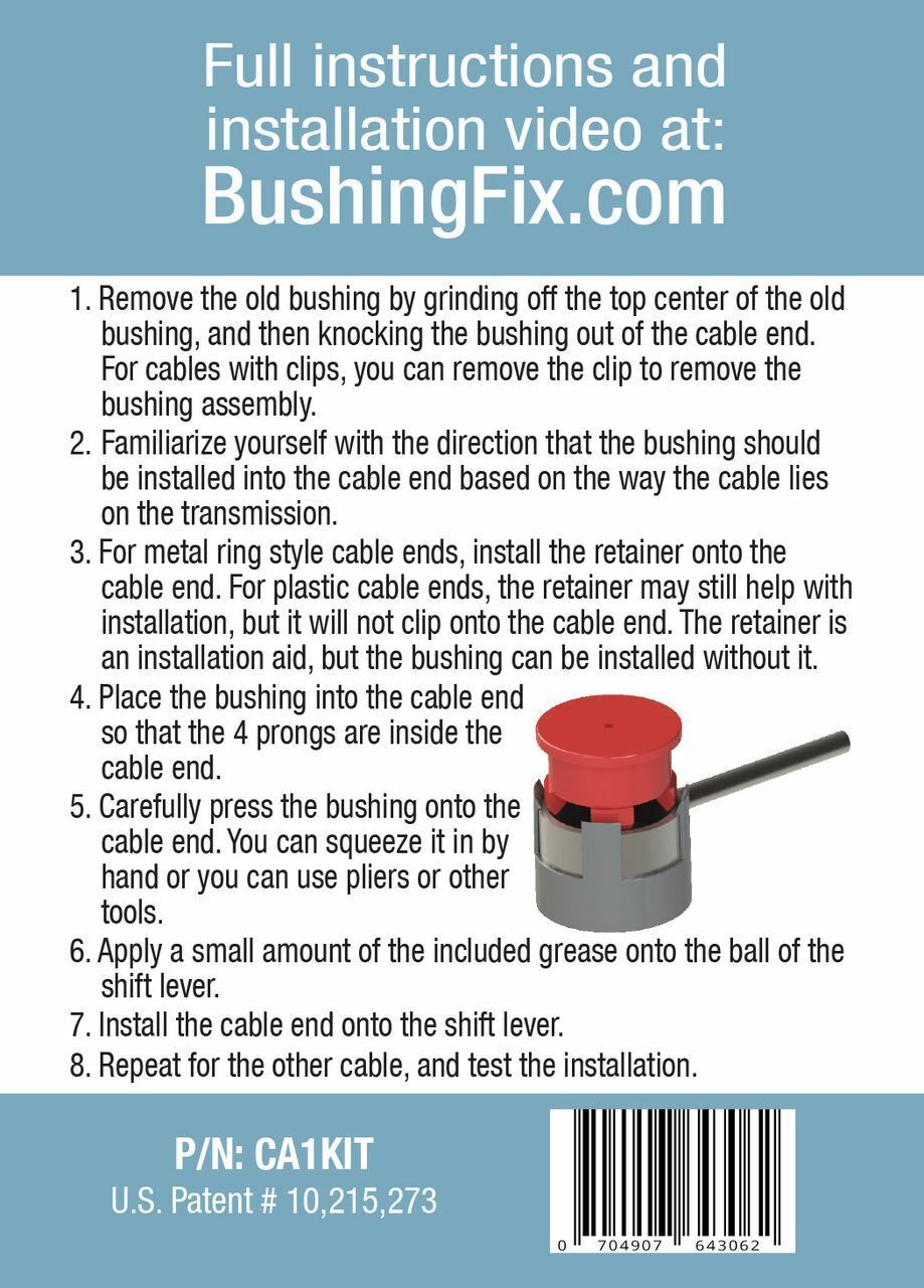 Chevrolet Cruze Ca1Kit (US patent #10,619,723 and #10,215,273) allows you to quickly and easily repair your manual transmission shift cables by replacing the bushing in each cable. The patented coupling and custom molded replacement bushings ensure a quality repair with ease. A professional can perform this repair in under 5 minutes, average time for a non-professional is less than 10 minutes. This bushings are made from a material that was designed to outlast the factory bushings and includes an installation guide. Bushing Fix CA1KIT?- Transmission Shift Cable Bushing Repair Kit ?; (US Patent # 10,215,273 and US Patent # 10,619,723).