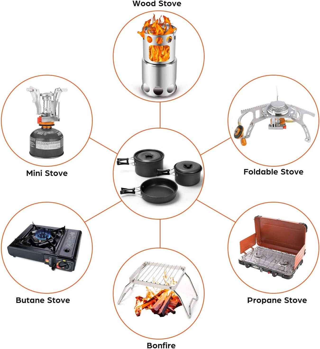 The Best Money You Ever Spent - The 15pcs camping cookware set includes 1 x L pot, 1 x S pot, 1 x fry pan, 2 x 230ml stainless steel cups with silicone protectors, 2 x 16cm stainless steel plates, 2 x forks, 2 x knives, 2 x spoons with 2 storage bags, 1 x cleaning cloth and 1 x carrying bag. This lightweight camp cookware set is a great choice for hiking, backpacking, camping or any other activity. Perfect For 1 To 2 People - The pots have 1.9L and 1L capacity, and the fry pan is of 5.7'' diameter. They will be great not just for boiling water but meal prep too. It's fully equipped and made to be used by 1 to 2 people. High Quality Pots And Pan - Both the pots and fry pan are made from anodized aluminum which is non-toxic and lightweight. Coated with a non-stick for easier use and clean up. Each piece has handles which are foldable and thermally isolated so you don?t burn your hand. Extra Stainless Steel Dinner Cutleries - You also receive several accessories - 2 sets of dinner cutleries and 1 cleaning cloth. The dinner cutleries are made from 304 stainless steel which is completely safe to use. All the forks knives spoons are foldable and can be easily packed into the cloth bags for simple storages. The cleaning cloth is safe to use on the coated surface and allows you fast and easy clean-up after you're done. All-In-1 Small Package - All pieces nest great, and everything is stacked together and packed into a nylon mesh bag. Total weight is just 2.75lbs, and the package size measures 7.5x7.5x5 inches. You should definitely consider this set for both backpacking as well as traditional camping.