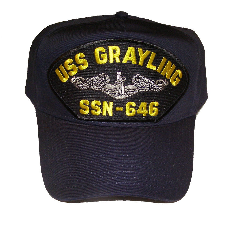 USS GRAYLING SSN-646 with Enlisted Silver Dolphins HAT - LARGER PATCH SIZE Approx 6" x 3" - Adjustable Size, Navy Blue Golf Style Hat. Veteran Owned and Operated Business