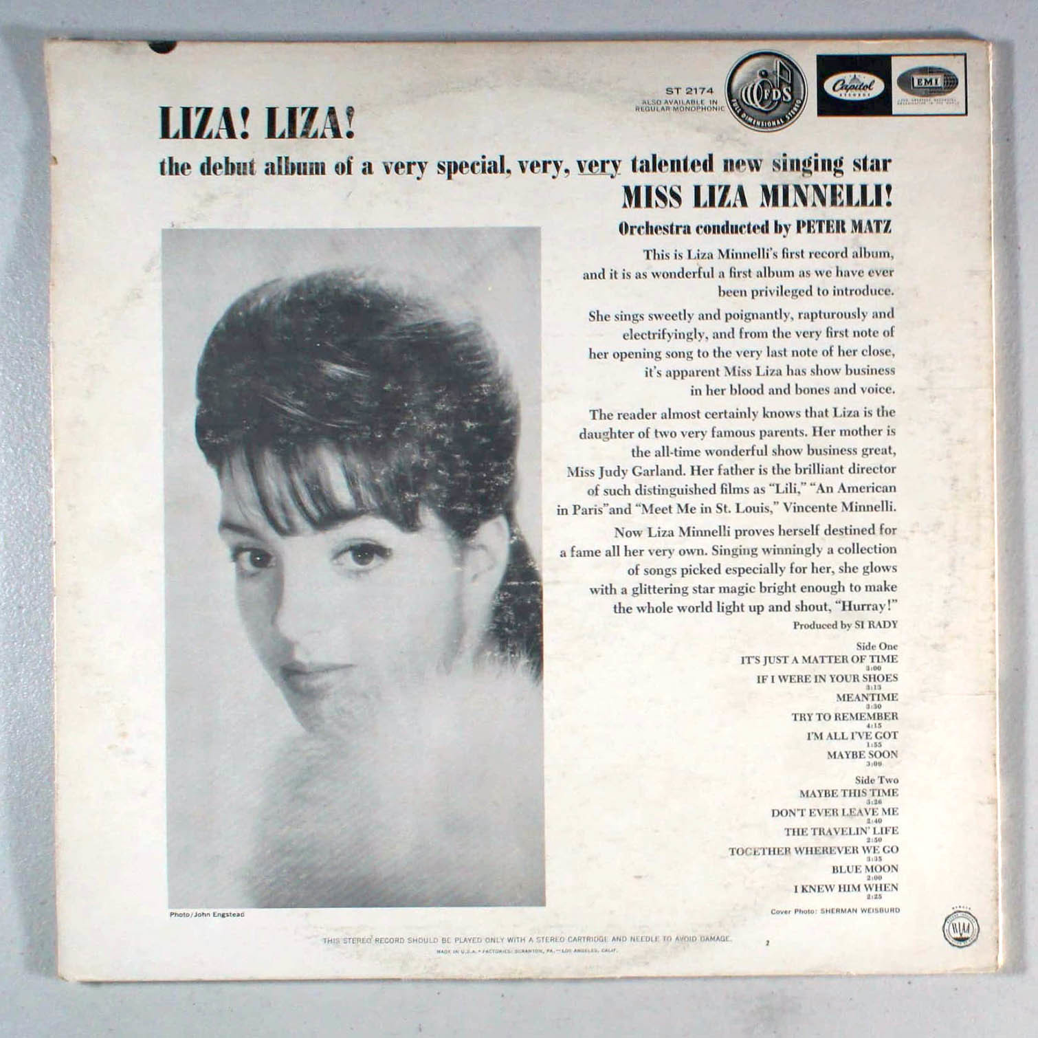 Liza! Liza! is the debut studio album by American singer Liza Minnelli. It was released on October 12, 1964, by Capitol Records. The album contains her interpretations of twelve pop standards. It was recorded in June 1964 at Capitol Records' New York studio at 151 West 46th Street. Liza! Liza! peaked on the Billboard 200 chart at No. 115