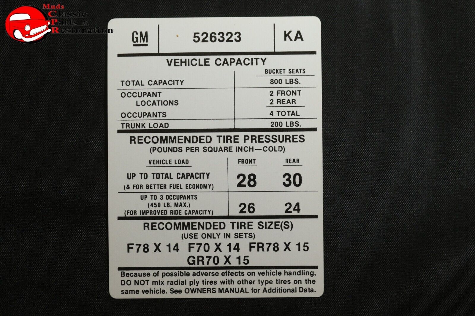 1976-1977 76 77 Pontiac Firebird Tire Pressure Decal Code "KA" KA 526323