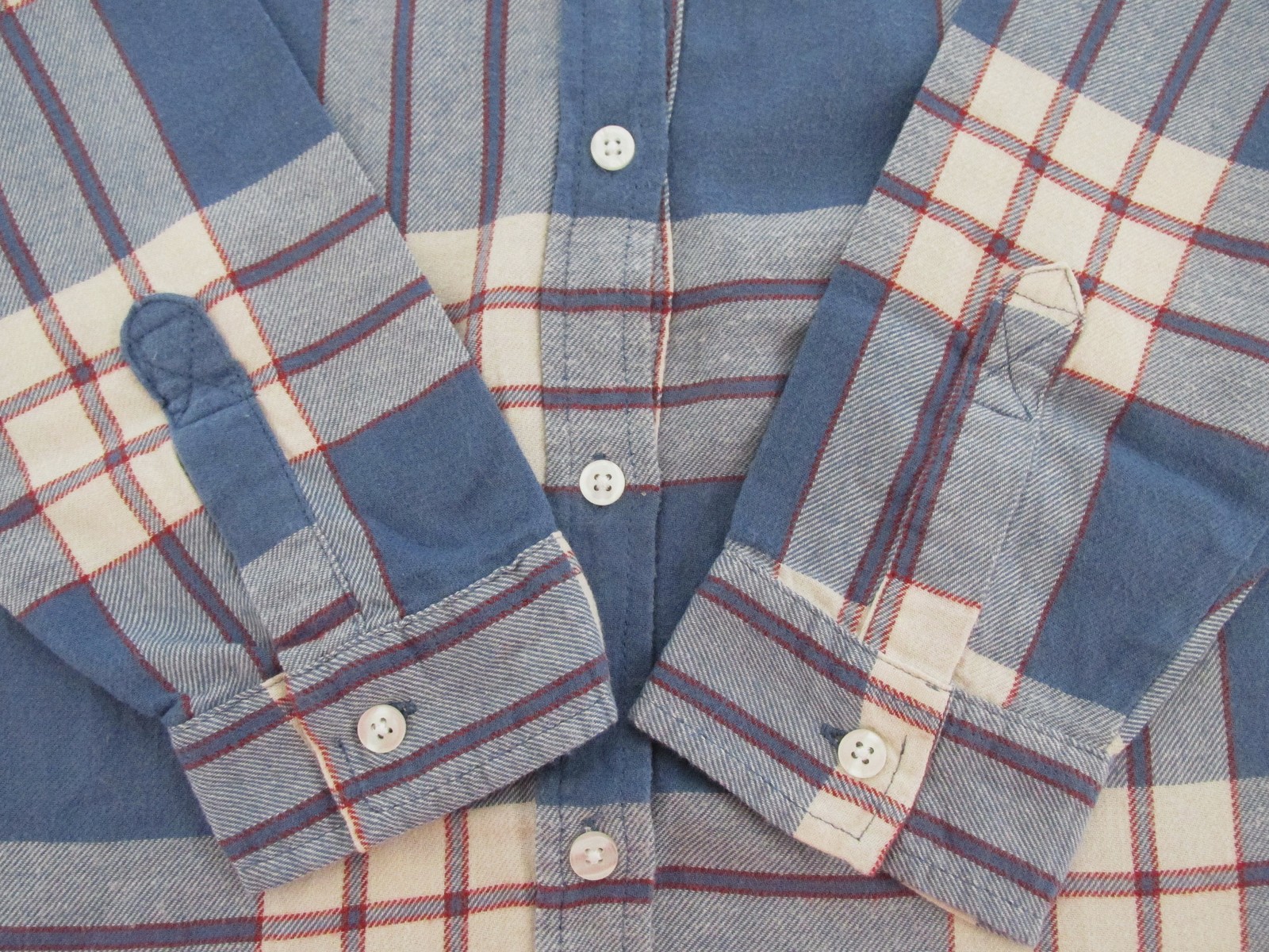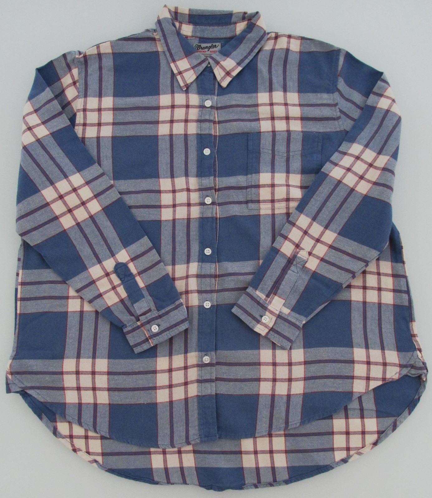 Description: Up for sale is a Wrangler Wrancher women's cotton long-sleeve shirt. It is made of 100% cotton. The size is XL. It has a multicolored plaid design in blue, red white. It has a full button front cuffs with 1 button breast pocket. This shirt is in excellent condition.
