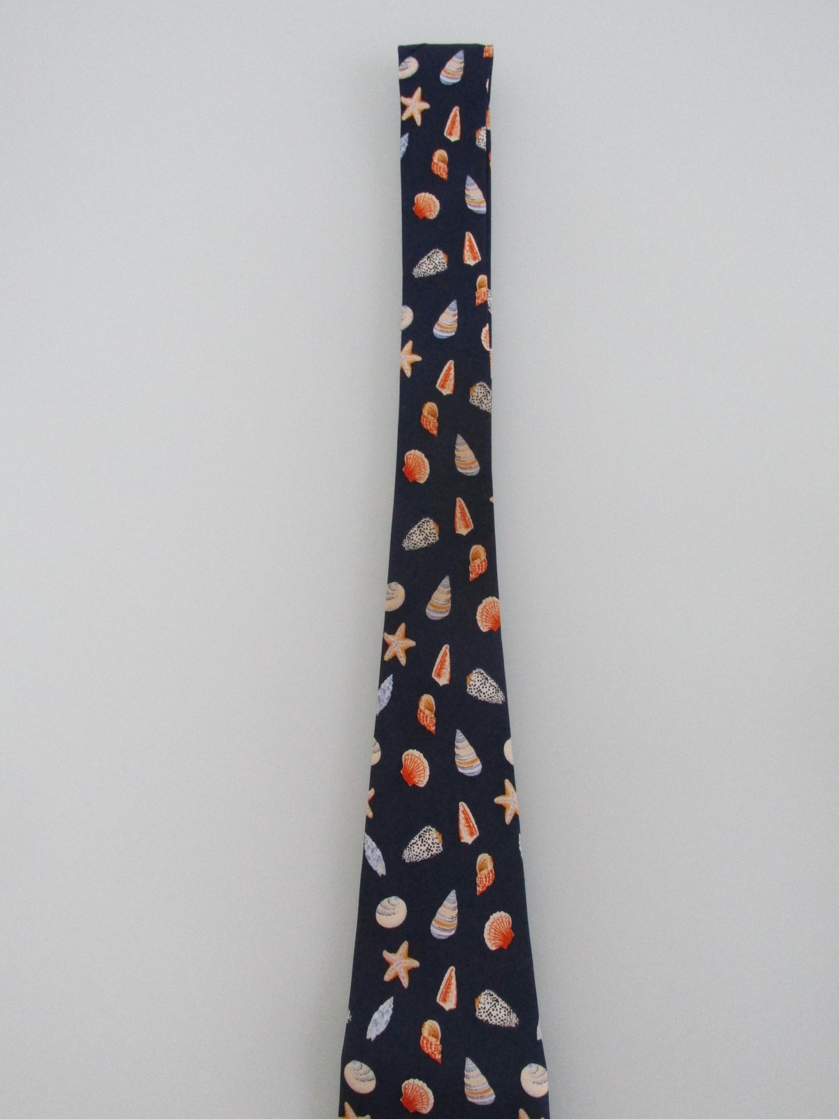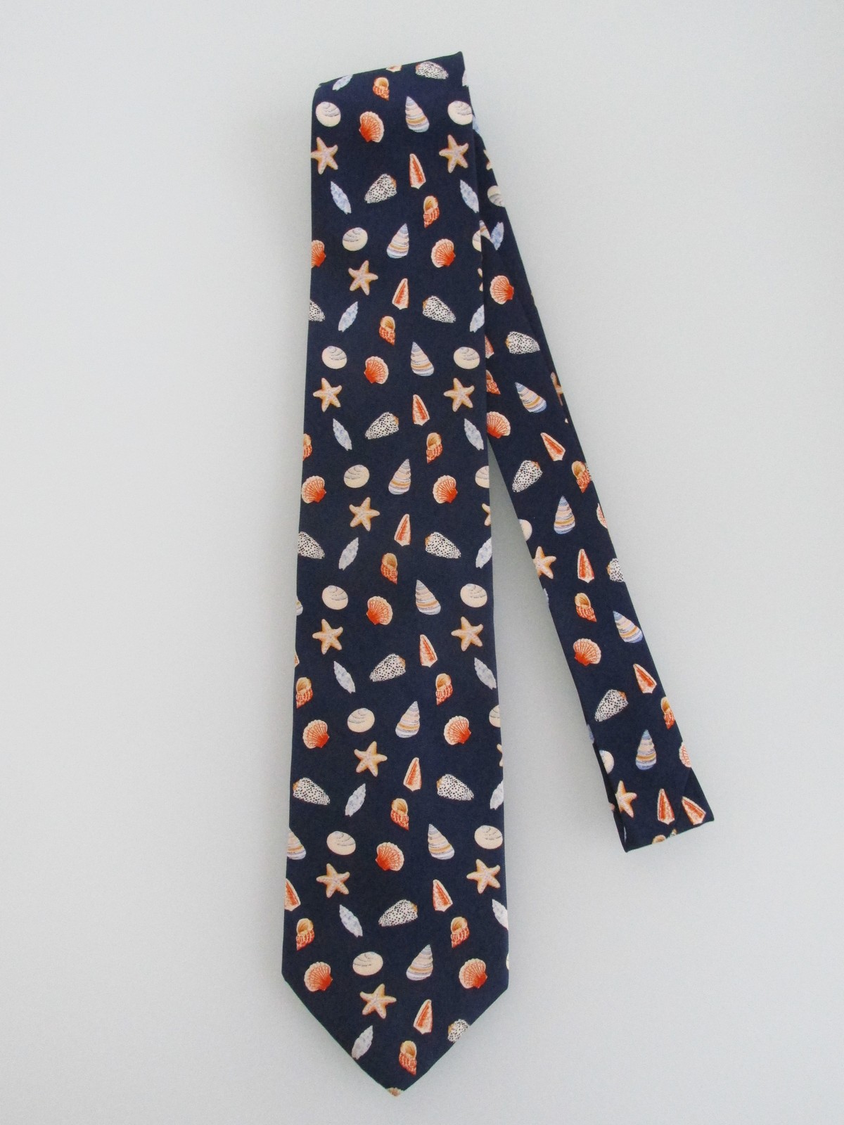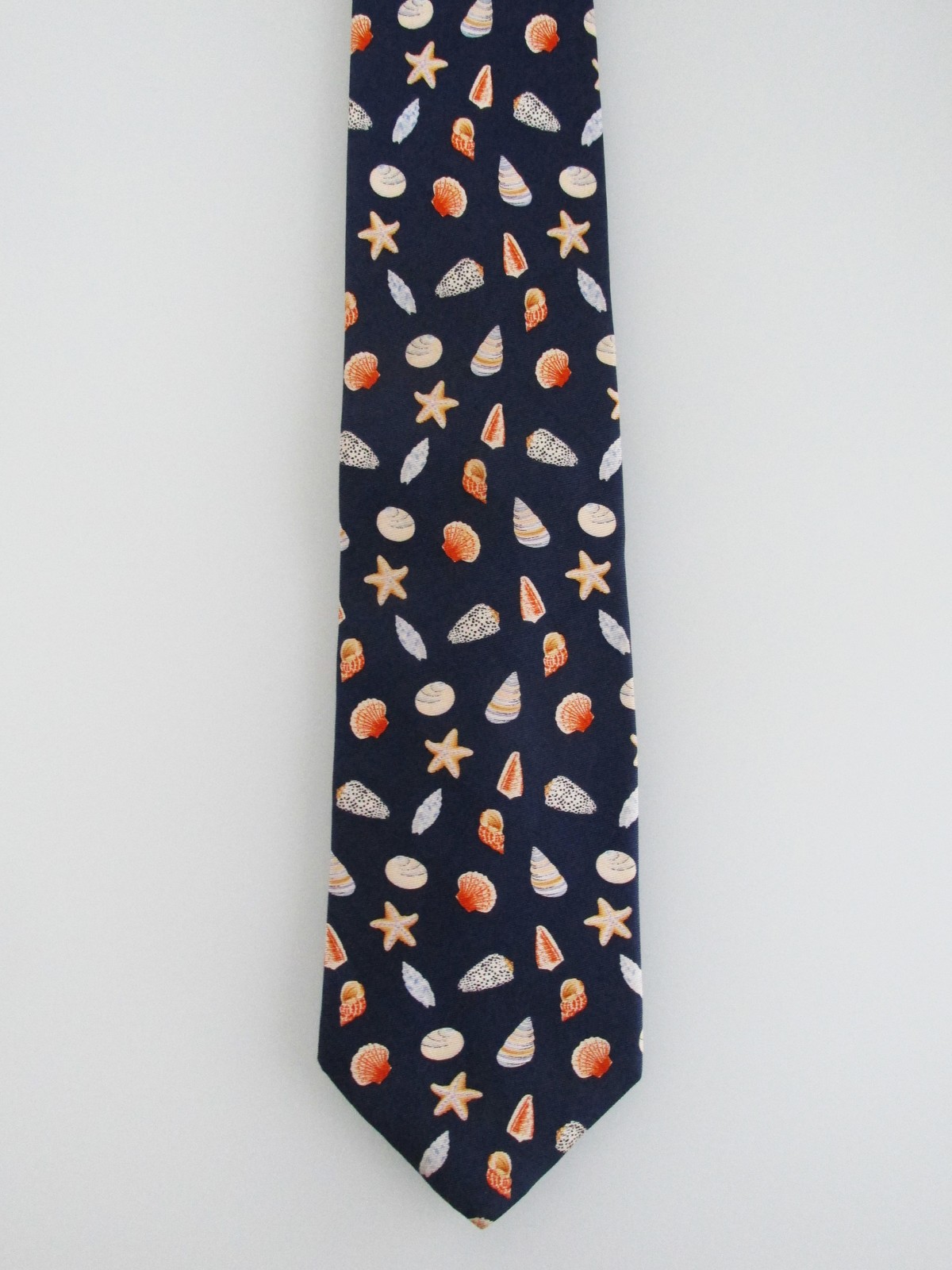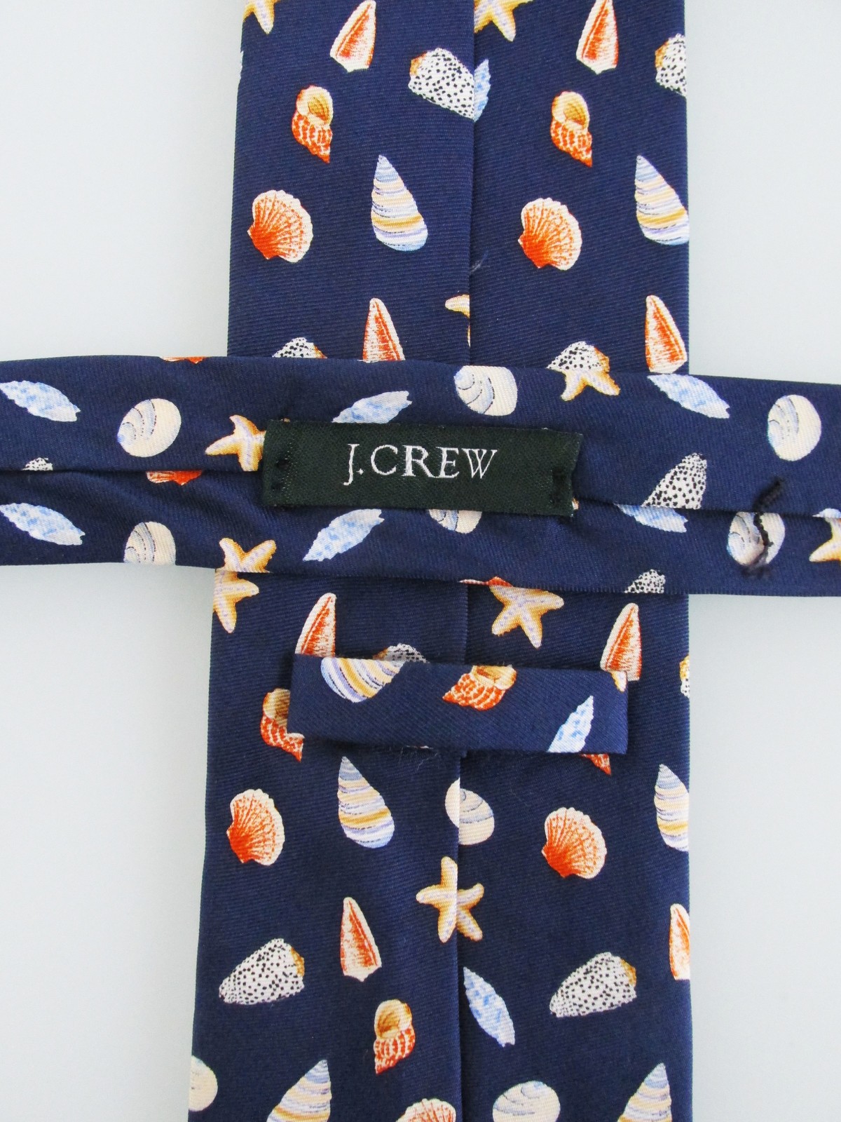 Description: Up for sale is a J. Crew men's silk tie. The tie is handmade in the USA of 100% silk. The tie has a multicolored seashell motif in lite blue, gold, orange, white on a navy blue background. Dimensions are approximately 60" long x 3 5/8" wide. This tie is in excellent condition.