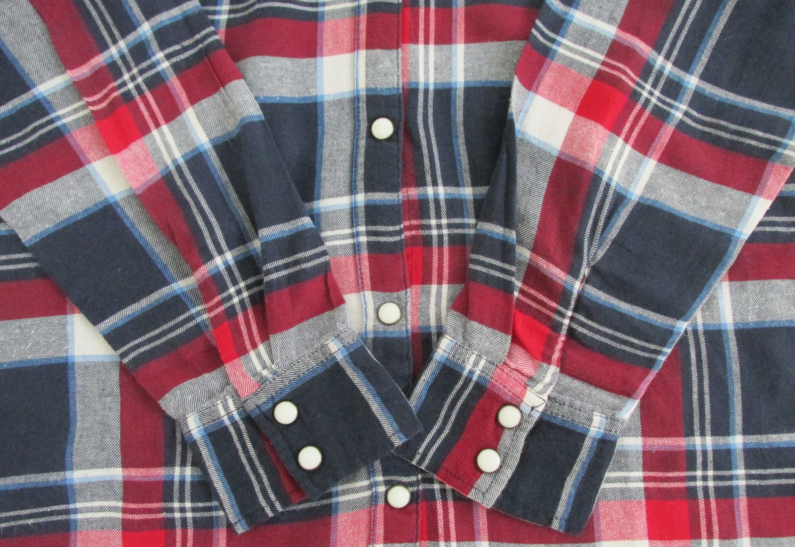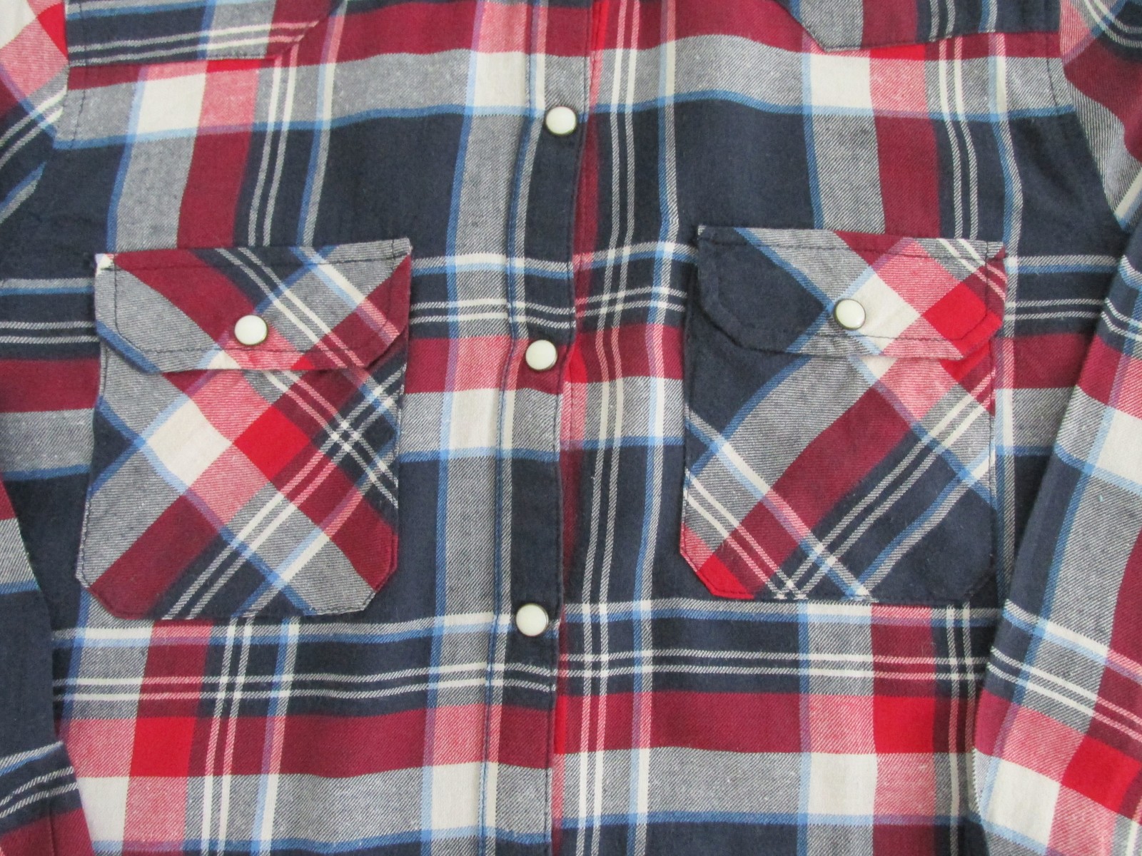 Description: Up for sale is a Forever 21 women's long-sleeved western shirt. The size is medium (Juniors). It is made of 99% cotton/1% spandex. It has a multicolored plaid design in blue, red white. This shirt has a white pearl snap button front and features 2 snap button flap pockets. This shirt is in very good condition.