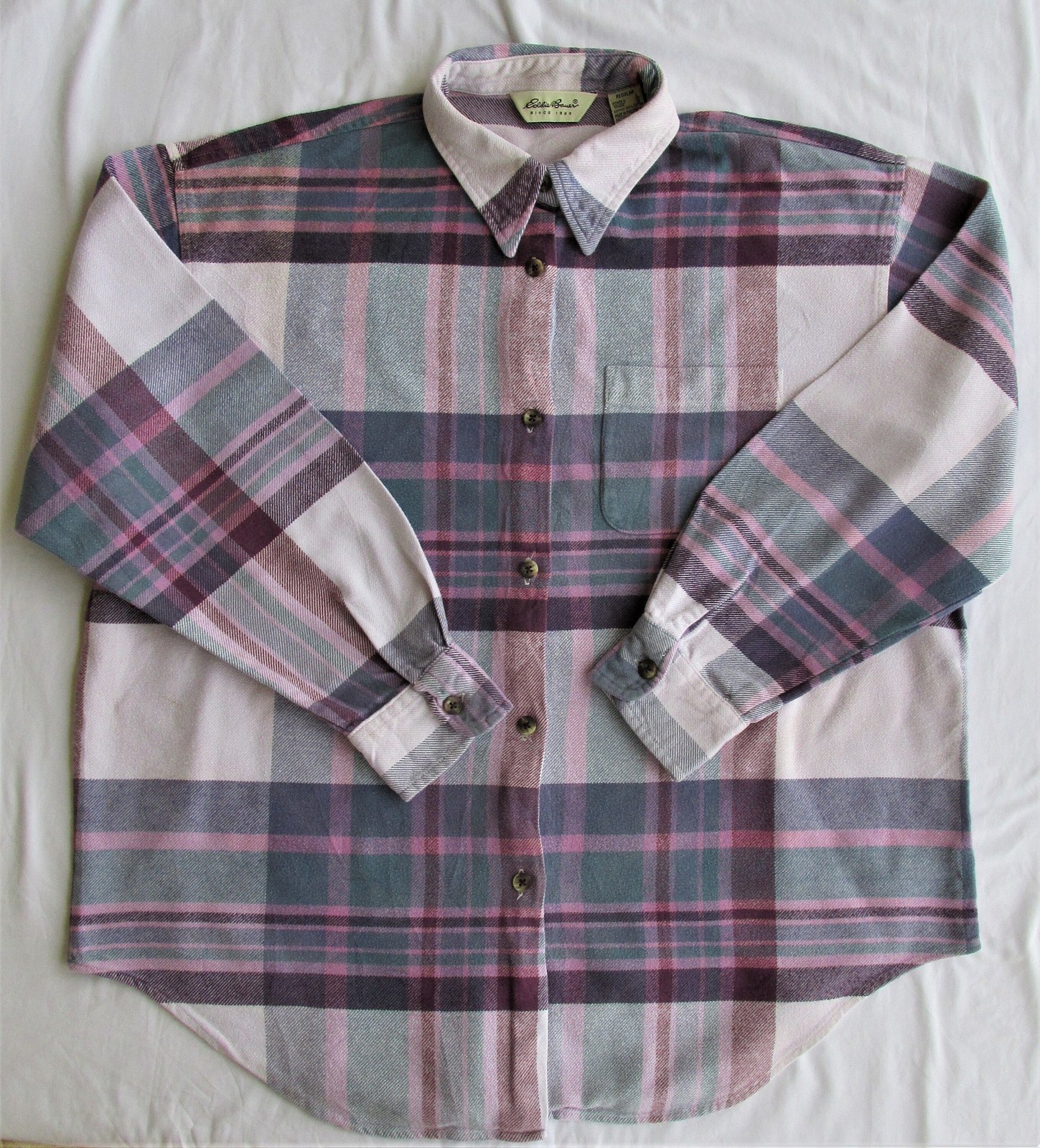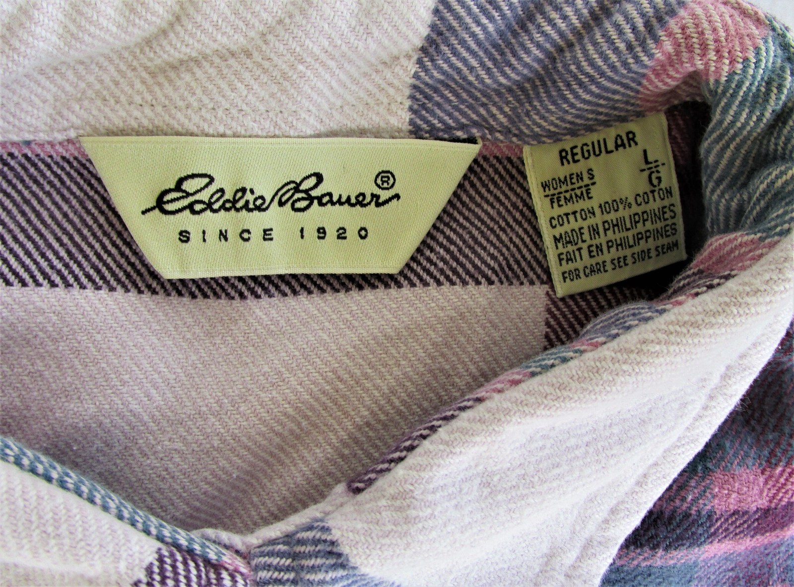 Description: Up for sale is an Eddie Bauer women's mediumweight cotton flannel shirt. The size is large. It is made of 100% cotton. This shirt has a multicolored plaid pattern in teal, cranberry, white, pink blue. It has a full button front cuffs with 1 breast pocket. It is in excellent condition.