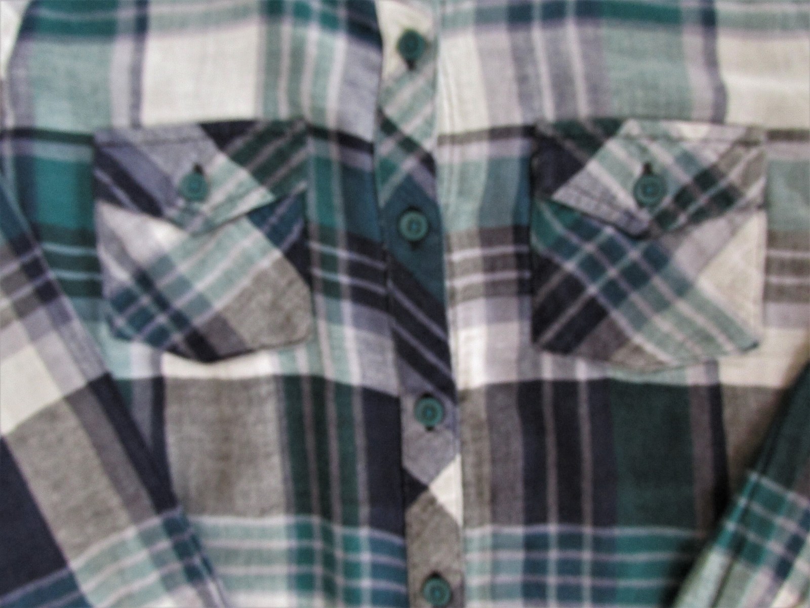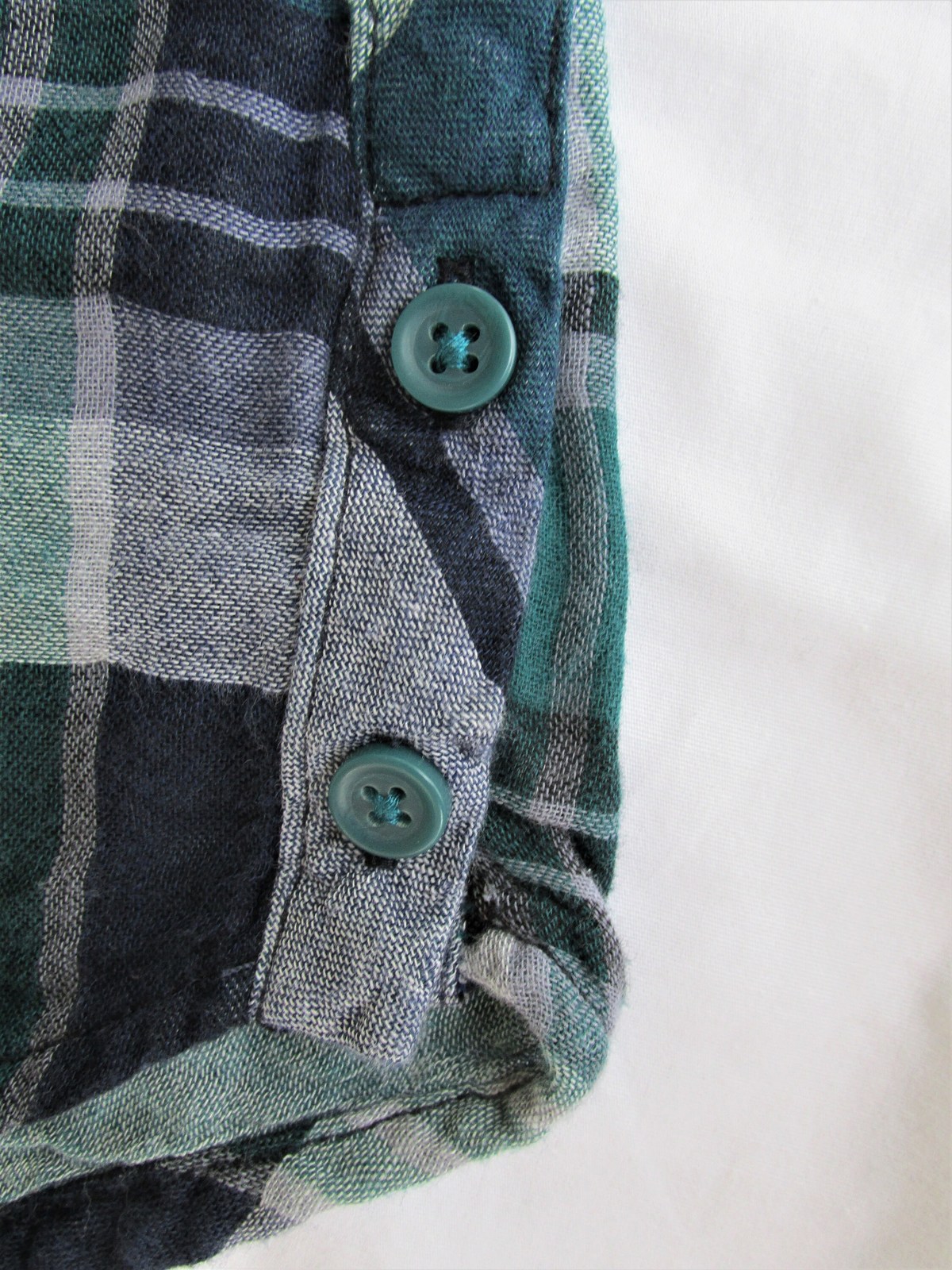 Description: Up for sale is a beachlunchlounge women's double-sided cotton shirt. The shirt is size XS. It is made of 100% cotton. It has a plaid design in green, white, gray black. The inside lining is a light heather green. It has a full button front cuffs with 2 button-flap breast pockets. It features side vents with buttons. It is in excellent condition.