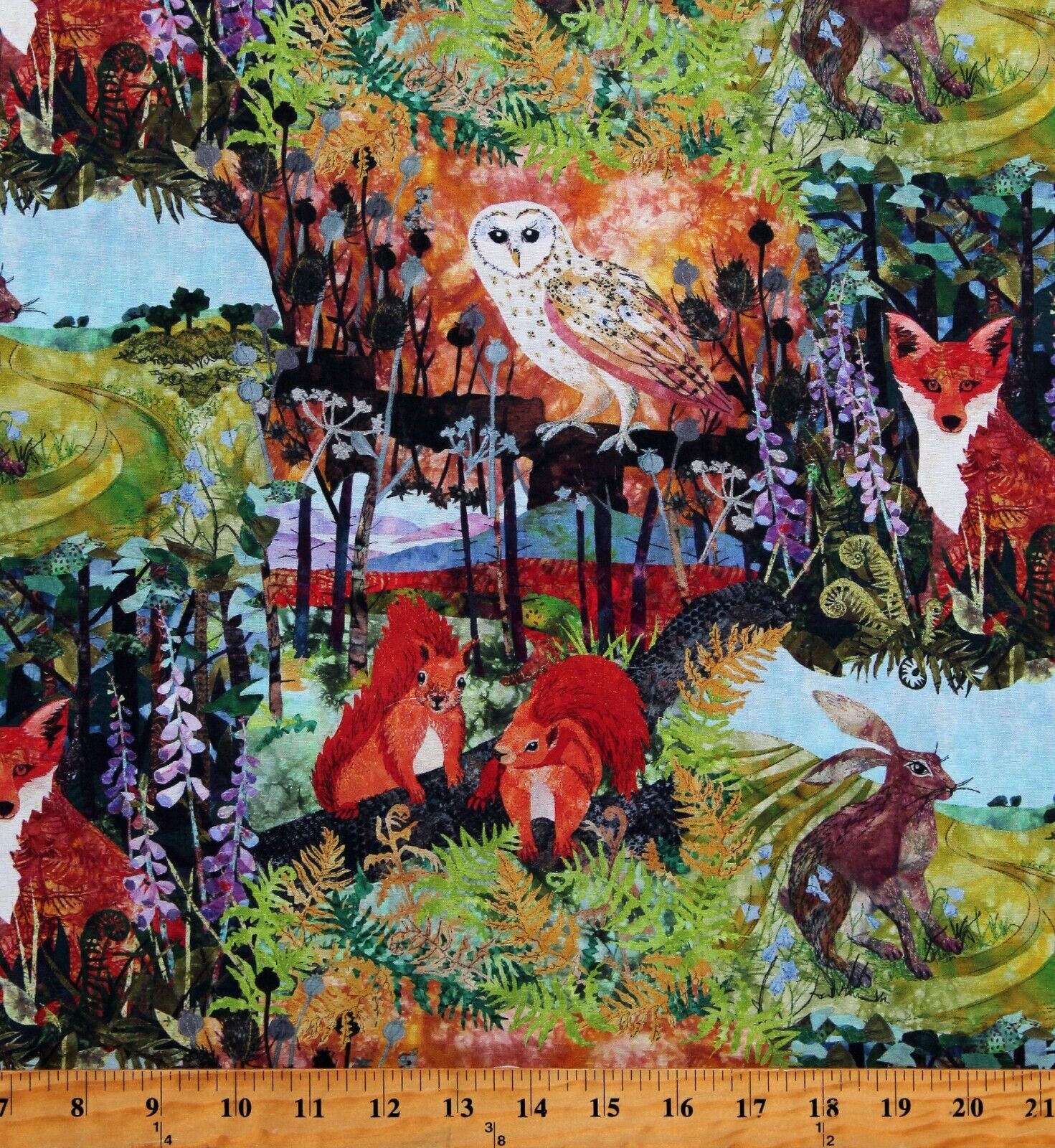 Cotton Woodland Animals Forest Creatures Foxes Owls Hares Squirrels Down in the Woods Digital Kids Cotton Fabric Print by the Yard (1508-66)