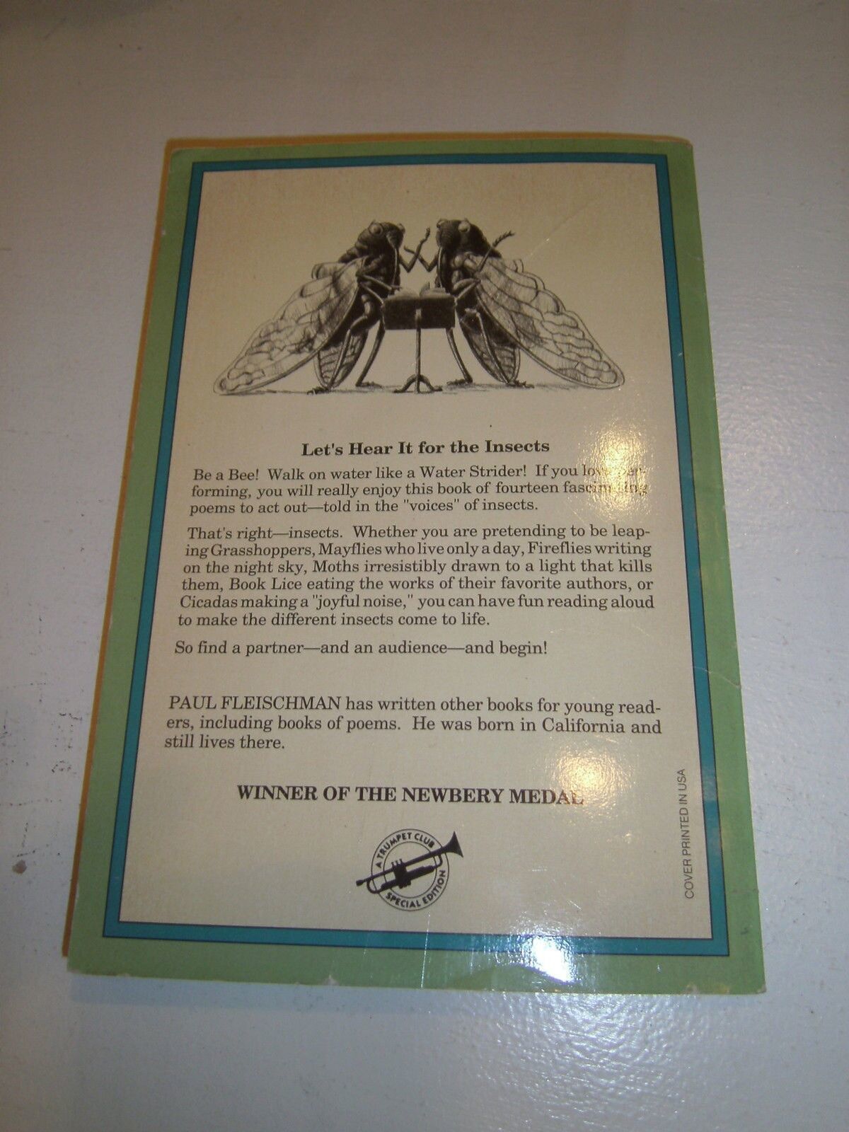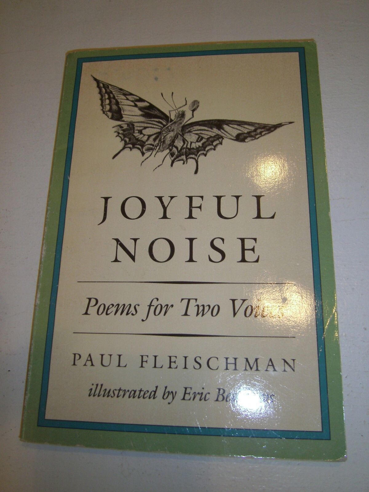 Joyful Noise, Poems for Two Voices by Paul Fleischman Illustrated by Eric Beddows 1989. Paperback with 44 pages. Reprinted with arrangements with Harper Row, Printed in USA September 1989 10 9 8 7 6 5 4 3 CW. (Number or Printing Line). Name written in front, First page has crinkle, Book has crinkle in it from manufacturing. Light wear on edges of Paper back. All text is readable and book is solid. Estate sale purchase.