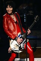 Joan Jett smiling in red leather jacket and pants playing guitar 18x24 poster