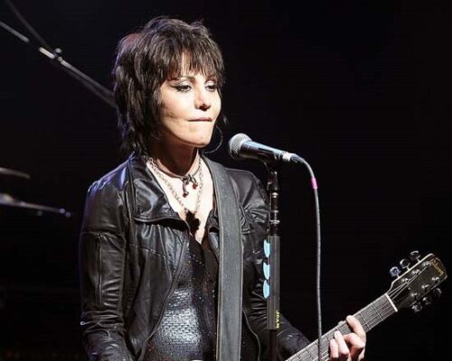 Joan Jett in leather jacket holding guitar in concert 18x24 poster
