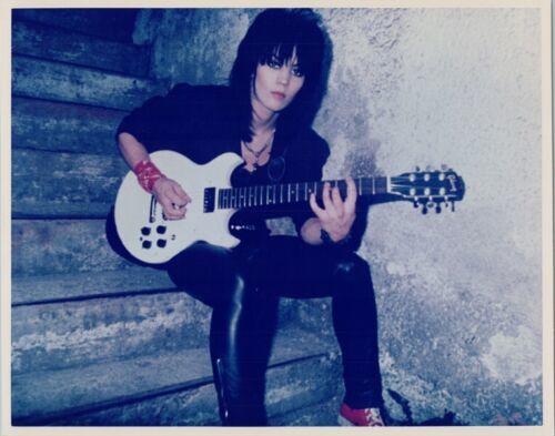 Joan Jett sits with guitar wearing leather vintage 1980's 8x10 photo