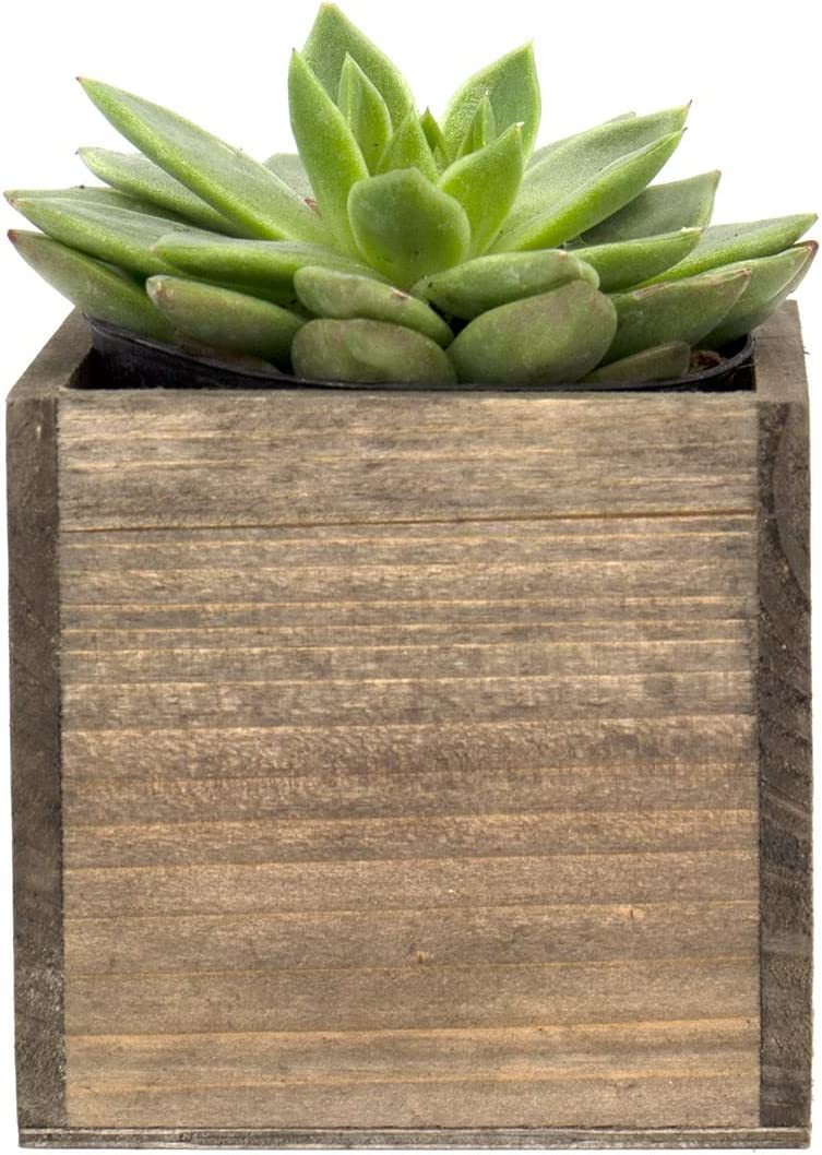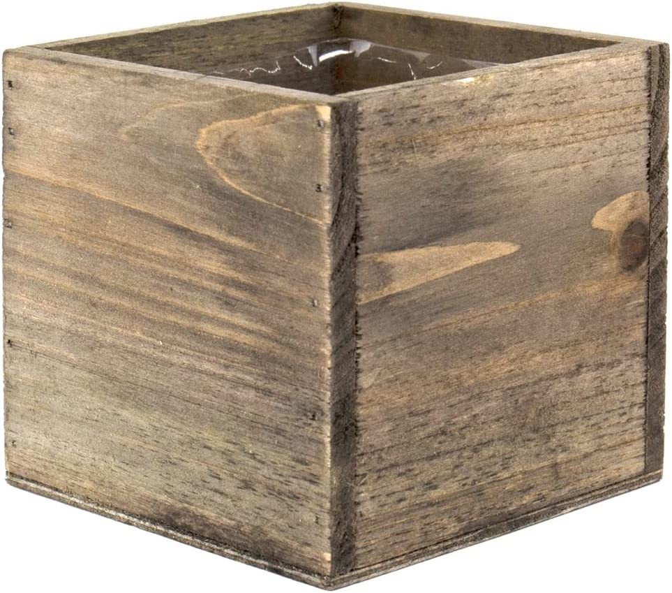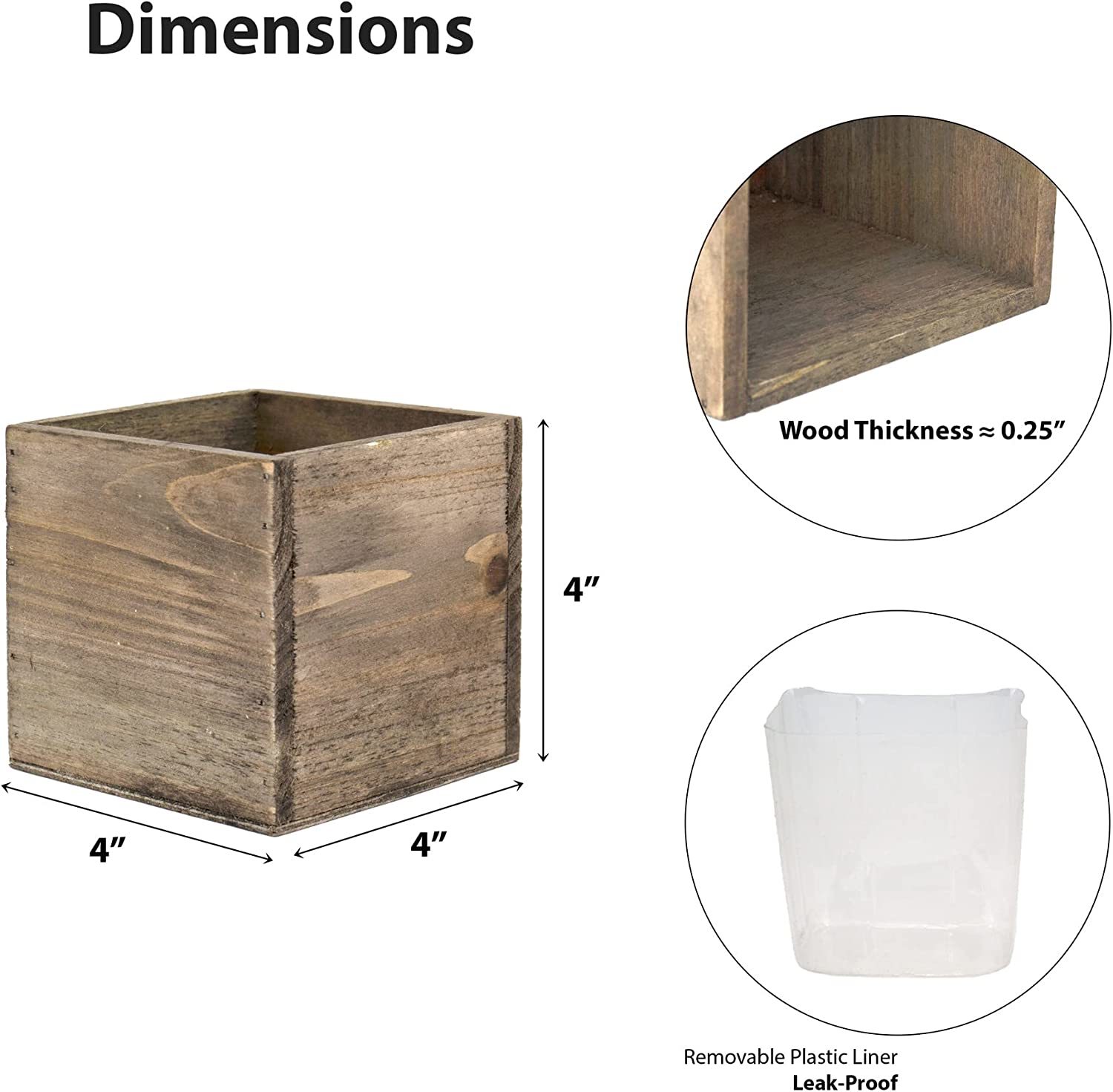 Dimensions - Height: 4" | Opening: 4"x4" | Interior Dimensions: L-3" x W-3" H-3.5" | Wood Thickness: 0.25" | Brown Wood Color | Pack of 4 Quality - Hand Made Paulownia Wood Planter Box. Removable watertight plastic liner included. Recommended for indoor use. Outdoor use may cause damage to the wood box due to outdoor conditions. No drainage hole included for plants. Design - The perfect sized planter box. The thick wood walls are glued and nailed together for strength and durability. The plastic liner is designed to hold the soil and plants within. Uses - The planter box is a great fit for your farm-style home decor. For all the modern urban home decor lovers, the wood planter box is an easy and practical decoration for the contemporary house. It is perfect for small plants and craft projects. Occasions - The wood planter box delivers a warming message to the surrounding environment. It attracts attention due to the natural character of the item. It makes for a unique centerpiece for any event or home. It also makes for the perfect gift.
