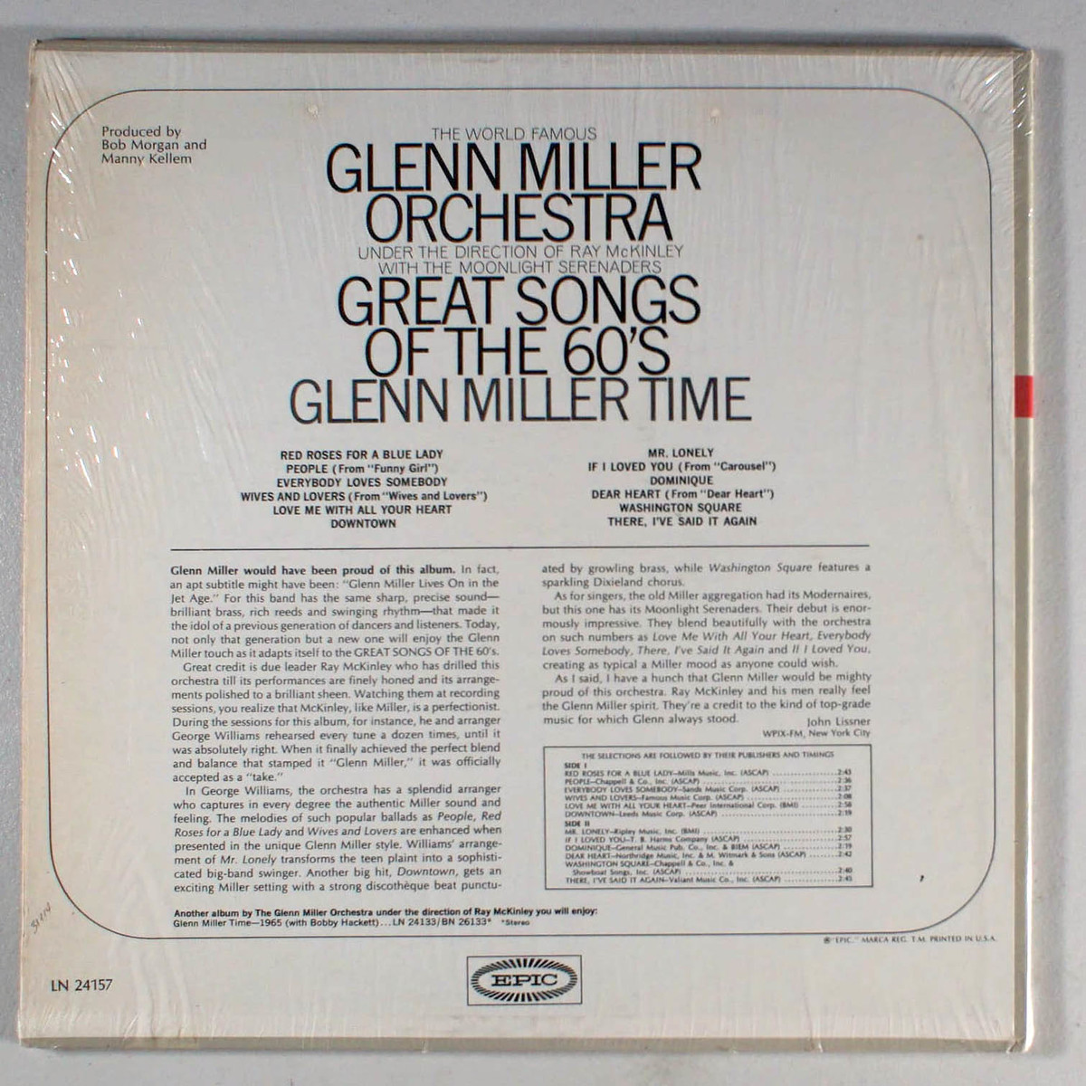 Great Songs of the 60's, by Glenn Miller Orchestra, was recorded under the direction of Ray McKinley with the Moonlight Serenaders. The orchestra captures every degree of the authentic Miller sound and feeling. The melodies of such popular ballads as People, Red Roses for a Blue Lady, and Wives and Lovers are enhanced when presented in the unique Glenn Miller style. Another big hit, Downtown, gets an exciting Miller setting with a strong discotheque beat punctuated by growling brass, while Washington Square features a sparkling Dixieland chorus.