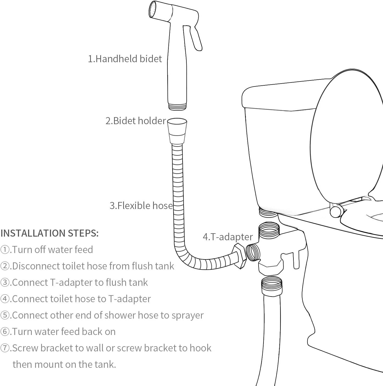 ?STAINLESS STEEL SPRAYER HEAD??Only compatible with 7/8" toilet.The FREDI bidet sprayer consists of a 304 stainless steel bidet nozzle, a stainless steel hose and a brass valve Resistant to corrosion and corrosion Better protect your sanitation. ?MULTIPLE USES??FREDI hand held bidet sprayer is a great suitable for the whole family, especially for anyone with limited mobility due to surgery, arthritis, postpartum or injuries, ideal for elderly adults, can be used as cloth diaper sprayer, bathroom cleaning and even for pet washing. ?Better Personal Hygiene?:The handheld bidet sprayer has 2 water pressure modes, Jet spray and Soft spray modes. Control the water pressure for a gentle and thorough clean up. An ideal choice for women during pregnancy and menstrual cycles. ?Easy to Install?:in 10 minutes without professional plumbing help, the holder can be mounted on the toilet or on a wall.When installing this unit be sure that the water supply valve by your toilet is fully turned off and that there is no flow/leak of water before removing any plumbing components from your toilet. ?After-Sale Service?: If you have any questions, please feel free to contact us through Amazon email. We will solve the problem for you within 24 hours.