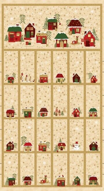 23.5" X 44" Panel Winter Houses Stars Snowflakes Christmas Star Sprinkle Advent Calendar Beige Gold Metallic Cotton Fabric Panel (4595-291P)