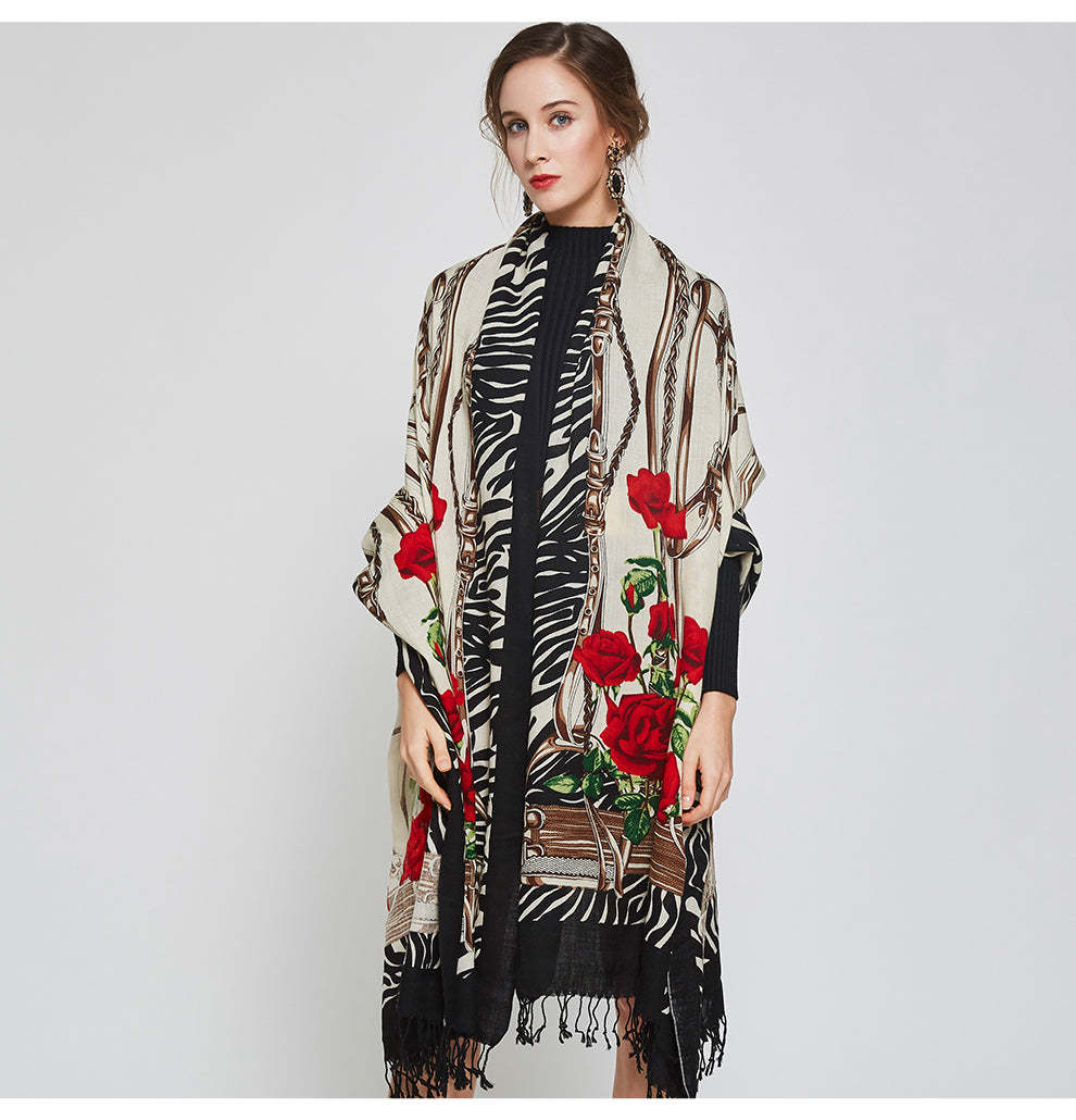 Anyyou Scarf 100% Pure Merino Wool Beige Rose Pattern Stylish Poncho Winter Larg