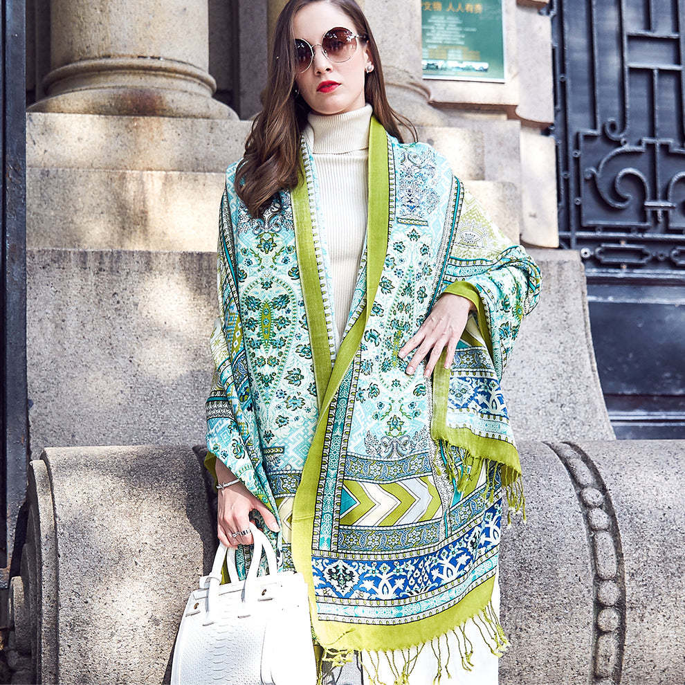 Anyyou 100% Pure Merino Wool Green Garden Vines Stylish Poncho Winter Large Scar