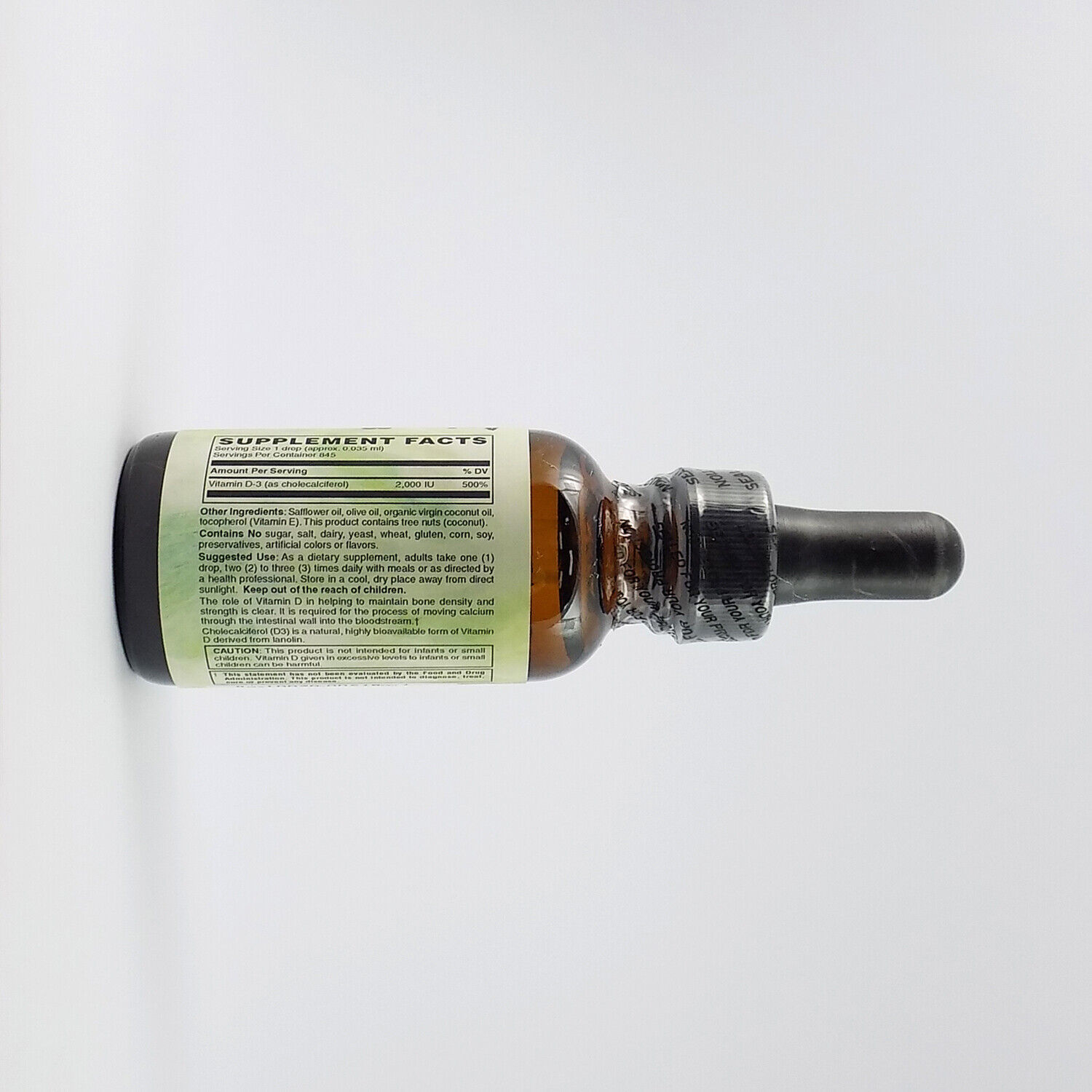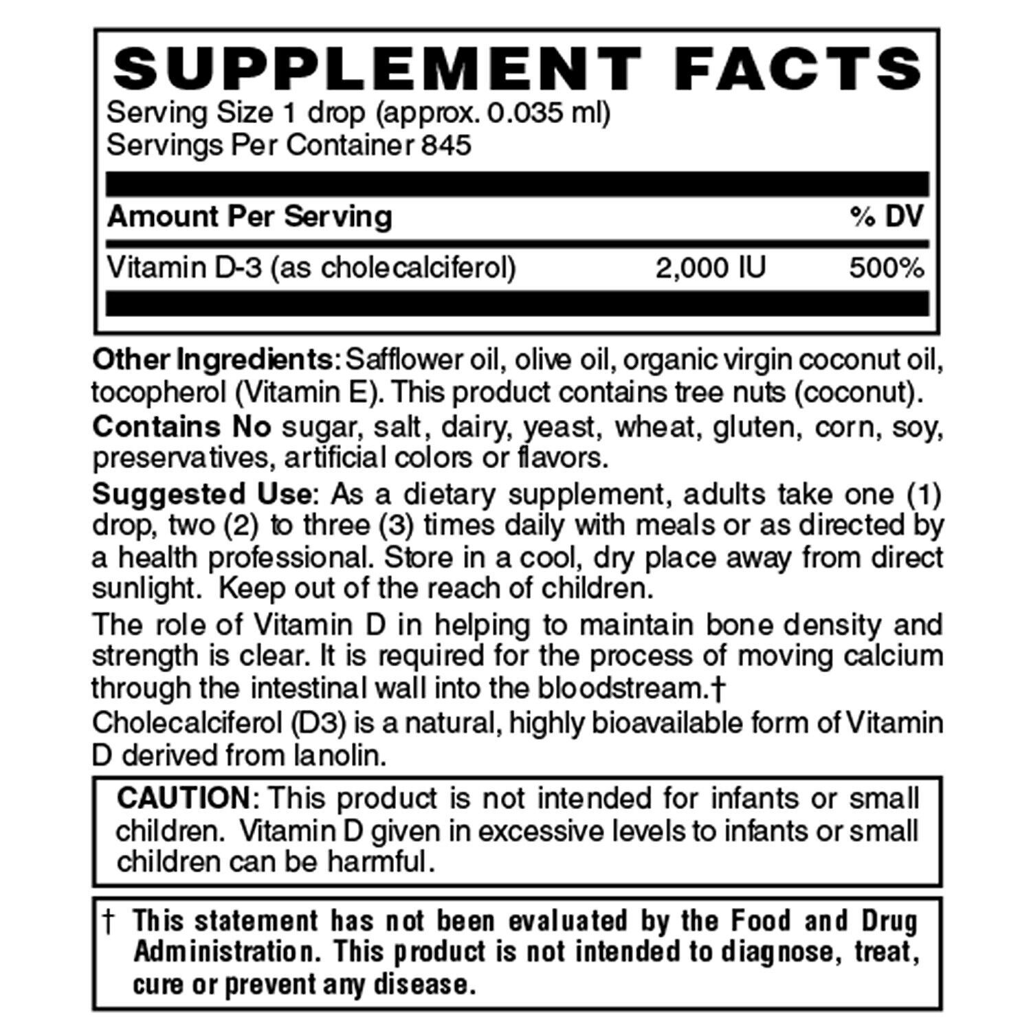 Vitamin D-3 (cholecalciferol) 2,000 IU, Safflower oil, olive oil, organic virgin coconut oil, tocopherol (Vitamin E). This product contains tree nuts (coconut).