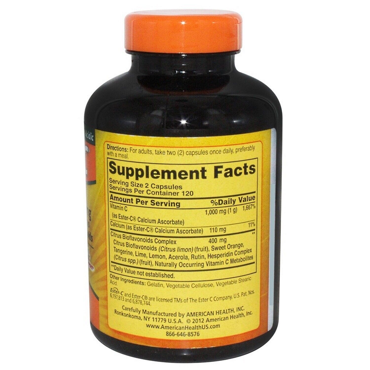 Supplement FactsServing Size: 2 CapsulesServings Per Container: 120Amount Per Serving %DVVitamin C (as Ester-C Calcium Ascorbate)1000mg1667%Calcium (as Ester-C Calcium Ascorbate)110mg 11% Citrus Bioflavonoids Complex400mg*Citrus Bioflavonoids (Citrus limon) (fruit), Sweet Orange, Tangerine, Lime, Lemon, Acerola, Rutin, Hesperidin Complex (Citrus spp.) (fruit), Naturally Occurring Vitamin C Metabolites*Daily Value Not Established.