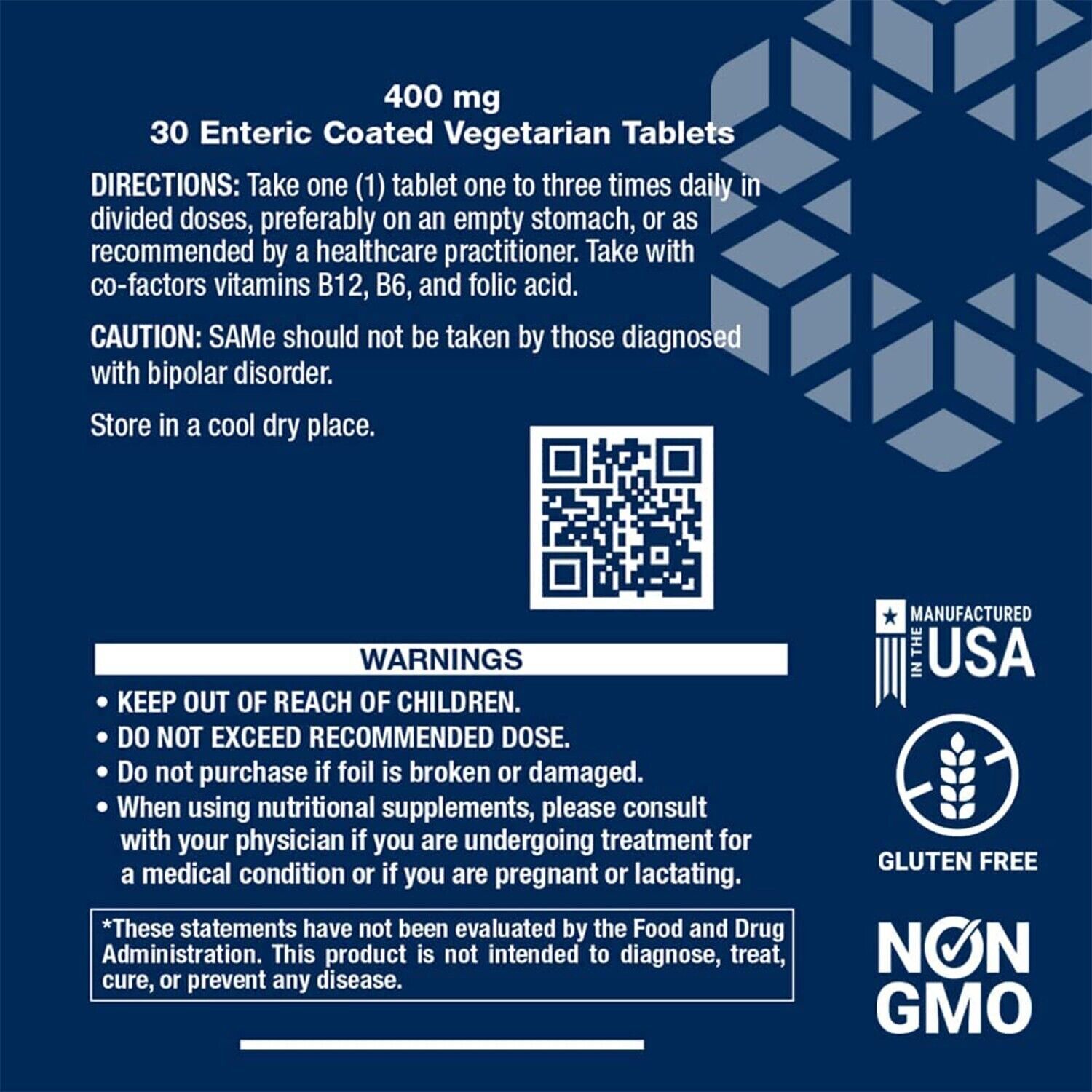 SAMe should not be taken by those diagnosed with bipolar disorder. Keep out of reach of children. Do not exceed recommended dose. Do not purchase if outer seal is broken or damaged. When using nutritional supplements, please consult with your physician if you are undergoing treatment for a medical condition or if you are pregnant or lactating.