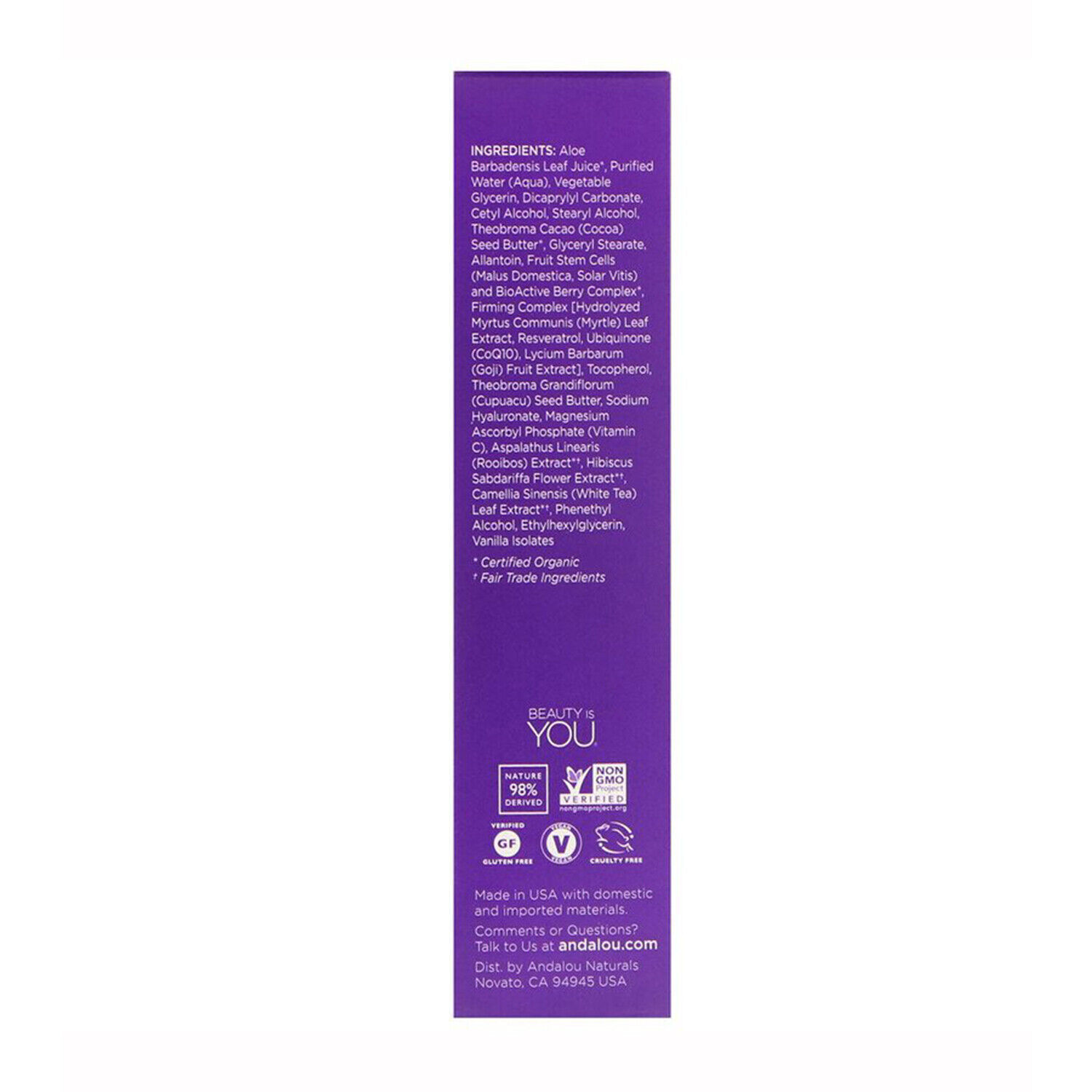 Aloe Barbadensis Leaf Juice*, Aqua/Water/Eau, Myristyl Myristate, Propanediol, Betaine, Butyrospermum Parkii (Shea) Butter*, Caprylic/Capric Triglyceride, Coco-Caprylate, Cetearyl Olivate, Sorbitan Olivate, Undecane, Cetyl Alcohol, Rhus Succedanea Fruit Wax, Theobroma Cacao (Cocoa) Seed Butter*, Malus Domestica Fruit Cell Culture Extract, Vitis Vinifera (Grape) Fruit Cell Extract, Aronia Melanocarpa Fruit Extract*, Euterpe Oleracea Fruit Extract*, Lycium Barbarum Fruit Extract*, Camellia Sinensis Extract, Linum Usitatissimum (Linseed) Seed Oil*, Oenothera Biennis (Evening Primrose) Oil*, Persea Gratissima (Avocado) Oil*, Rosa Canina Fruit Oil*, Borago Officinalis Seed Oil*, Fagus Sylvatica Bud Extract, Symphytum Officinale Leaf Extract, Squalane, Allantoin, Ascorbyl Tetraisopalmitate, Hydrolyzed Rice Protein, Hydrolyzed Sodium Hyaluronate, Pichia/Resveratrol Ferment Extract, Glycogen, Ubiquinone, Tocopherol, Riboflavin, Helianthus Annuus (Sunflower) Seed Oil, Cetyl Palmitate, Tridecane, Sorbitan Palmitate, Glycerin, Xanthan Gum, Sclerotium Gum, Lecithin, Isomalt, Pullulan, Silica, Gluconolactone, Palmitic Acid, Calcium Gluconate, Parfum (Fragrance), Benzyl Alcohol, Dehydroacetic Acid, Ethylhexylglycerin, Sodium Benzoate, Potassium Sorbate, Citric Acid *Certified Organic, Fair Trade