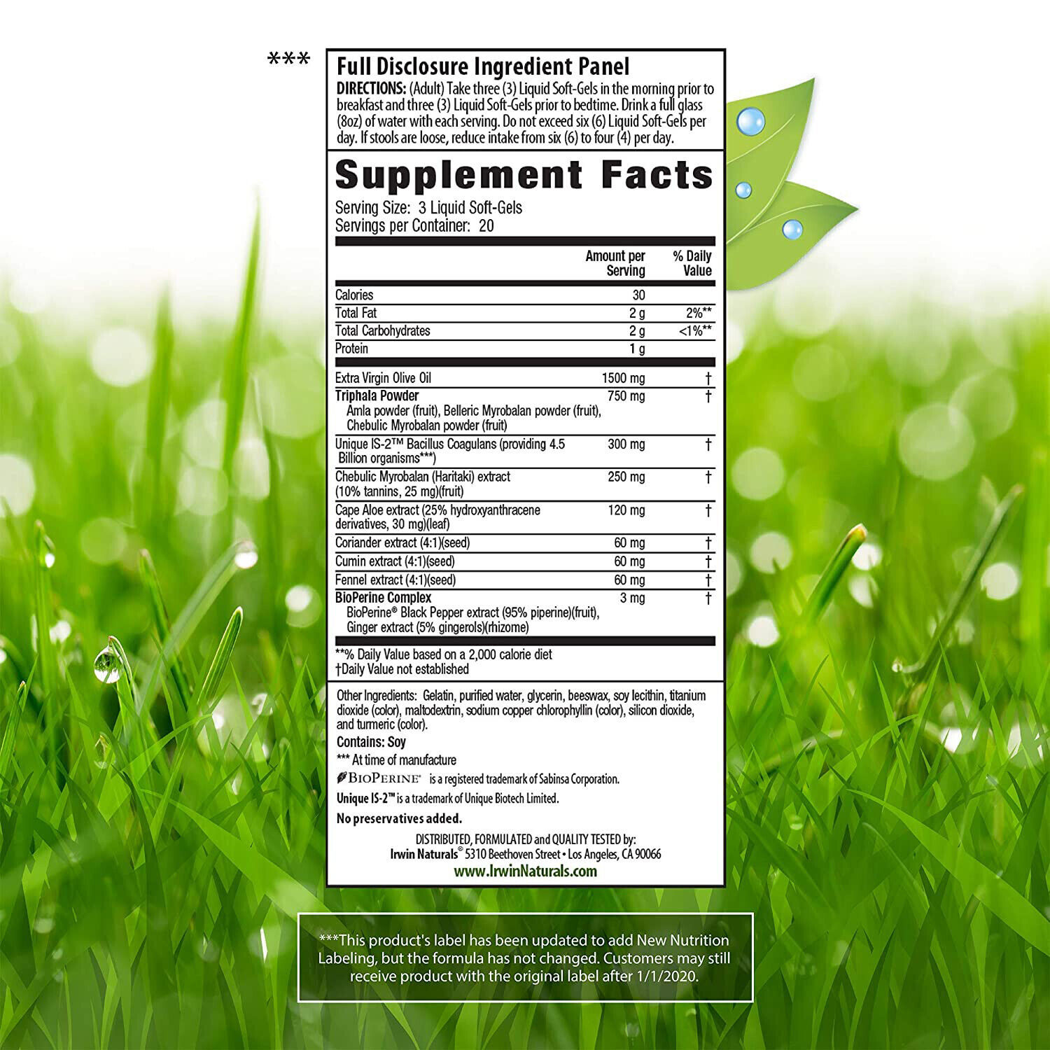 Extra Virgin Olive Oil, Triphala Powder (Alma powder [fruit], Belleric Myrobalan powder [fruit], Chebulic Myrobalan powder [fruit]), Unique IS-2 Bacillus Coagulans (providing 4.5 Billion organisms), Chebulic Myobalan (Haritaki) Extract (10% tannins, 25mg)(fruit), Cape Aloe extract (25% hydroxyanthracene derivatives, 30mg)(fruit), Coriander extract (4:1)(seed), Cumin extract (4:1)(seed), Fennel extract (4:1)(seed), BioPerine Complex (BioPerine Black Pepper extract, Ginger extract). Other ingredients: Gelatin, purified water, glycerin, beeswax, soy lecithin, titanium dioxide (color), maltodextrin, sodium copper chlorophyllin (color), silicon dioxide, and turmeric (color).