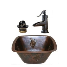 15" Square Copper Bar Prep Sink with GRAPES Design with Drain and 7" ORB Faucet