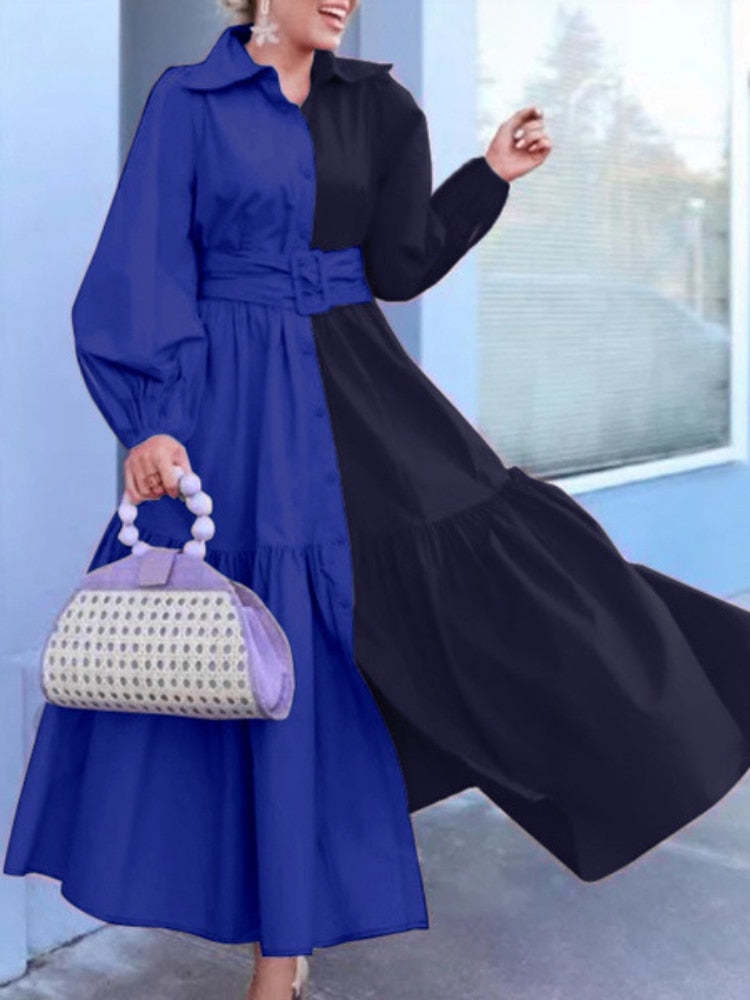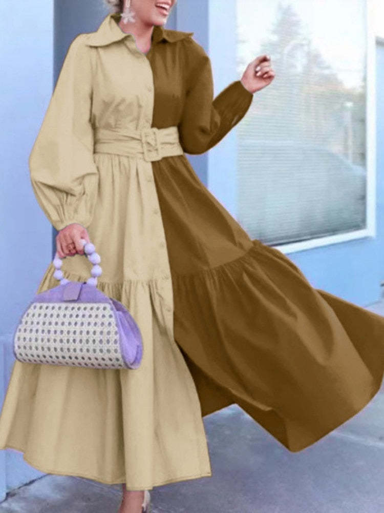 Spring Autumn Lapel Belt Waist Long Dress