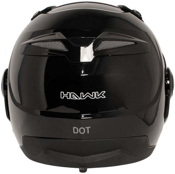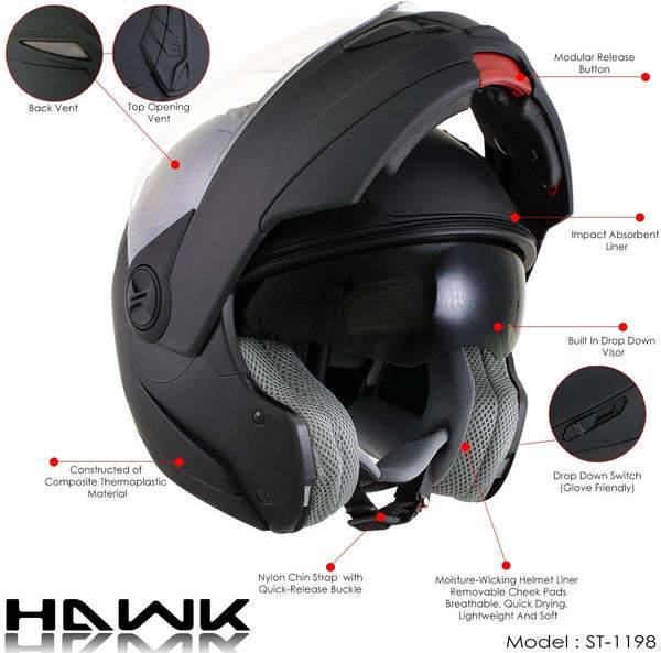 PRODUCT DETAILS ITEM DESCRIPTION HAWK Helmets ST 1198 Glossy Black Modular Motorcycle Full Face Helmet for Men Women with Dual Flip Up Sun Visor DOT Approved for Bike Scooter ATV UTV Chopper Skateboard The HAWK Helmets ST 1198 Black helmet made in a glossy black UV protective finish and a dual flip up sun visor. Light weight around 3.5 pounds (weight will vary upon size), eliminating neck fatigue on those long trips with your motorcycle scooter moped cruiser UTV ATV touring bike motorbike or other street bike. Fully vented high density EPS liner to increase strength cooling and safety along with a dual sun visor. All the HAWK Helmets are certified by Department of Transportation - DOT approved - and made to enhance the riding experience with maximum safety and comfort offers world class protection at an affordable price. HAWK Helmets ST 1198 Glossy Black Modular Motorcycle Full Face Helmet Features: Certified by the Department of Transportation of the United States - DOT Approved A HAWK Helmets design for adult unisex. A full face helmet for men and a beautiful full helmet for women. Advanced composite thermoplastic shell construction Aerodynamic shell design for stability at higher speeds Flip up chin bar and face shield Impact absorbent high density liner comfort Drop down inner shield, deploy by sliding the glove friendly switch located on left side of helmet Dual sun/dust visor Less bulky than normal helmets with maximum protection Lightweight Helmet Around 3.5 lbs. (weight will vary upon size) Certified by Department of Transportation DOT and has passed or exceeds all requirements of the US FMVSS No. 218 safety regulations. Engineered with a fully vented multi density EPS liner to greatly absorb impact so you can feel confident riding your motorcycle bicycle scooter cruiser chopper moped ATV UTV motorbike or street bike. Aerodynamic shell design for stability at higher speeds with a small footprint and incredibly light weight at around 3.5 lbs. (weight will vary upon size). Made of advanced composite thermoplastic shell construction for maximum protection. Fully cleanable inner comfort padding mesh material which is designed to increase durability and add an extra touch of style and easy push and pull. Flip up chin bar and face shield, front easy to actuate button easily flips up to turn from. Upper and lower chin bar intake vents for maximum airflow is adjusted by glove friendly dials on each intake vent. Light weight durable aerodynamic shell with glossy UV protective finish with a dual sun/dust visor. A HAWK Helmets design for adult unisex - a great full helmet for men and a beautiful full face helmet for women. Mesh layer on forehead of helmet provides air circulation and accelerated moisture evaporation.