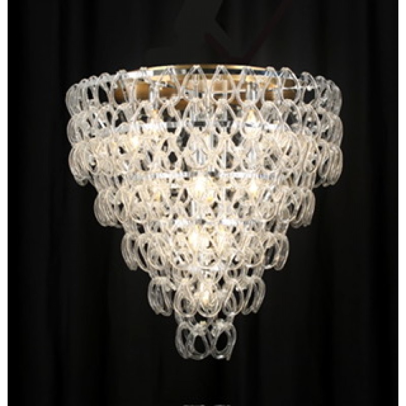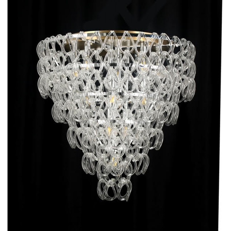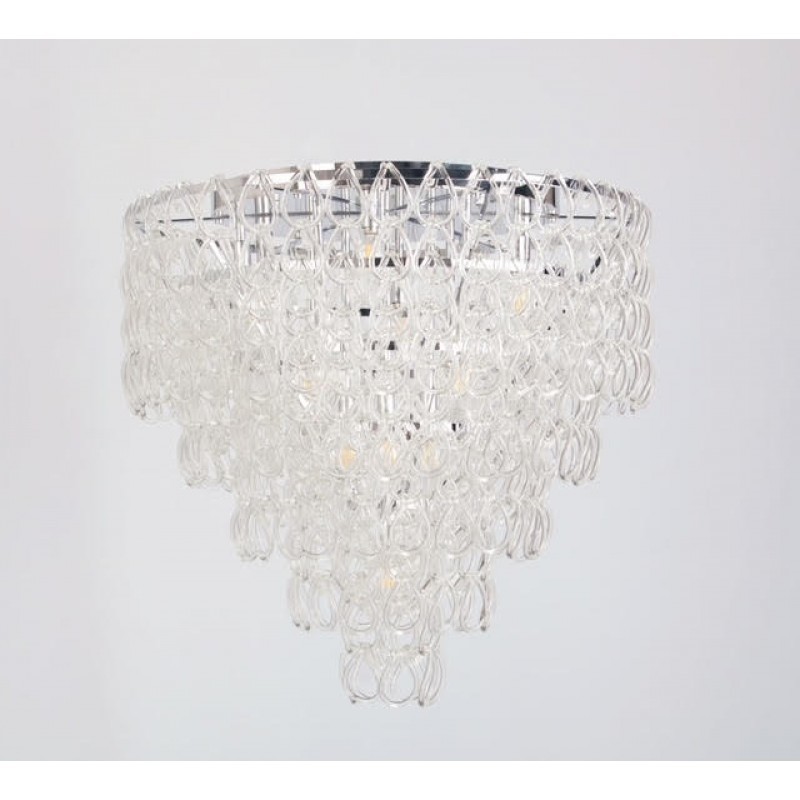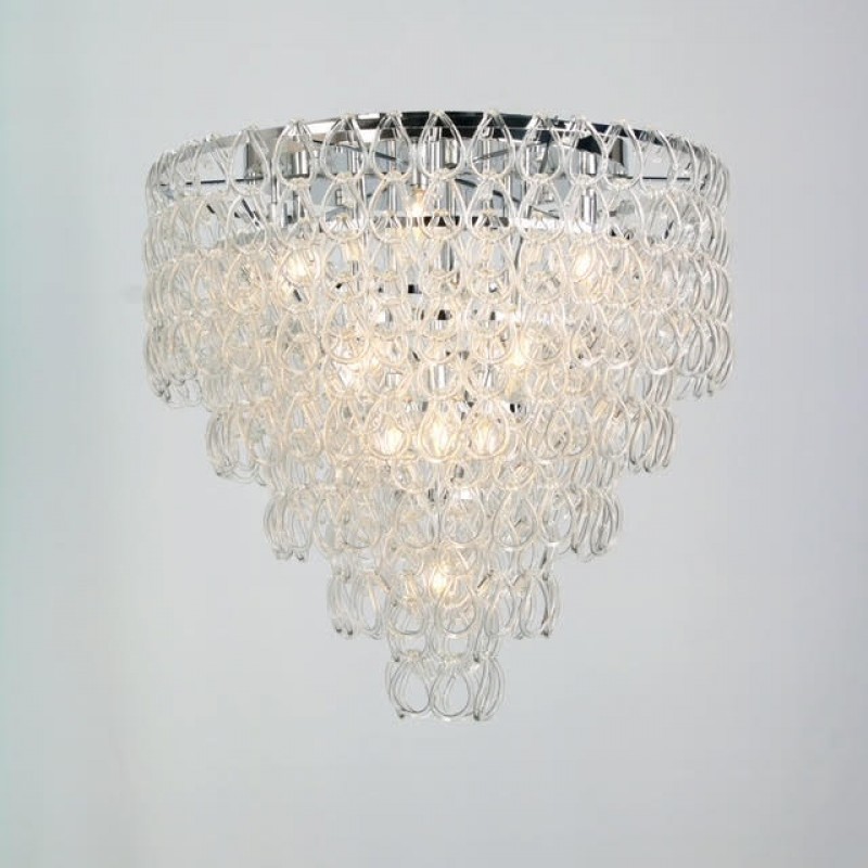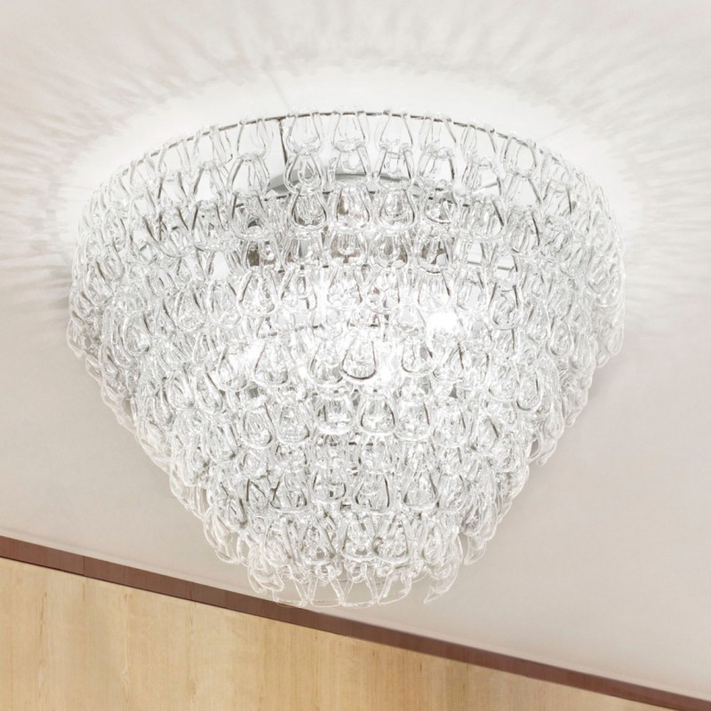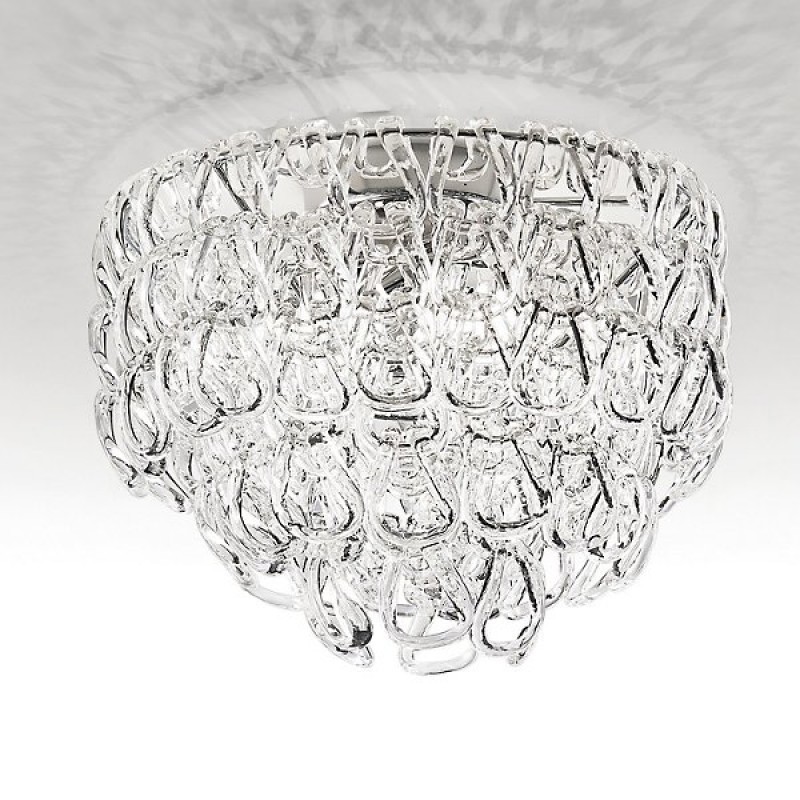 Flush Mount features handmade crystal elements which create a unique lighting effect when the fixture is illuminated. Vistosi's mission is to produce Murano glass creations of excellent quality and refined design. Vistosi works with internationally renowned designers, who closely follow the latest trends and market demands. The Vistosi collection includes chandeliers, floor lamps, table lamps and wall sconces constructed from hand blown glass and crystal configured in unique shapes and designs. Vistosi is a magnificent, elegant fixture that can be used in modern living rooms and dining rooms. The fixture is made from glass, with chains linked together. The glass is clear and transparent, and creates ambient lighting in any space.
