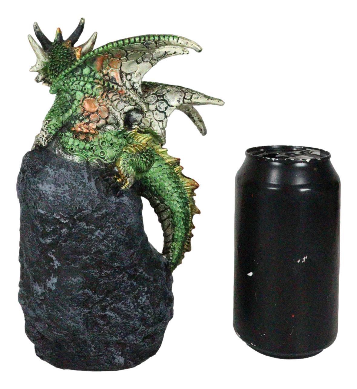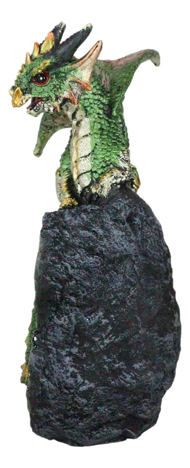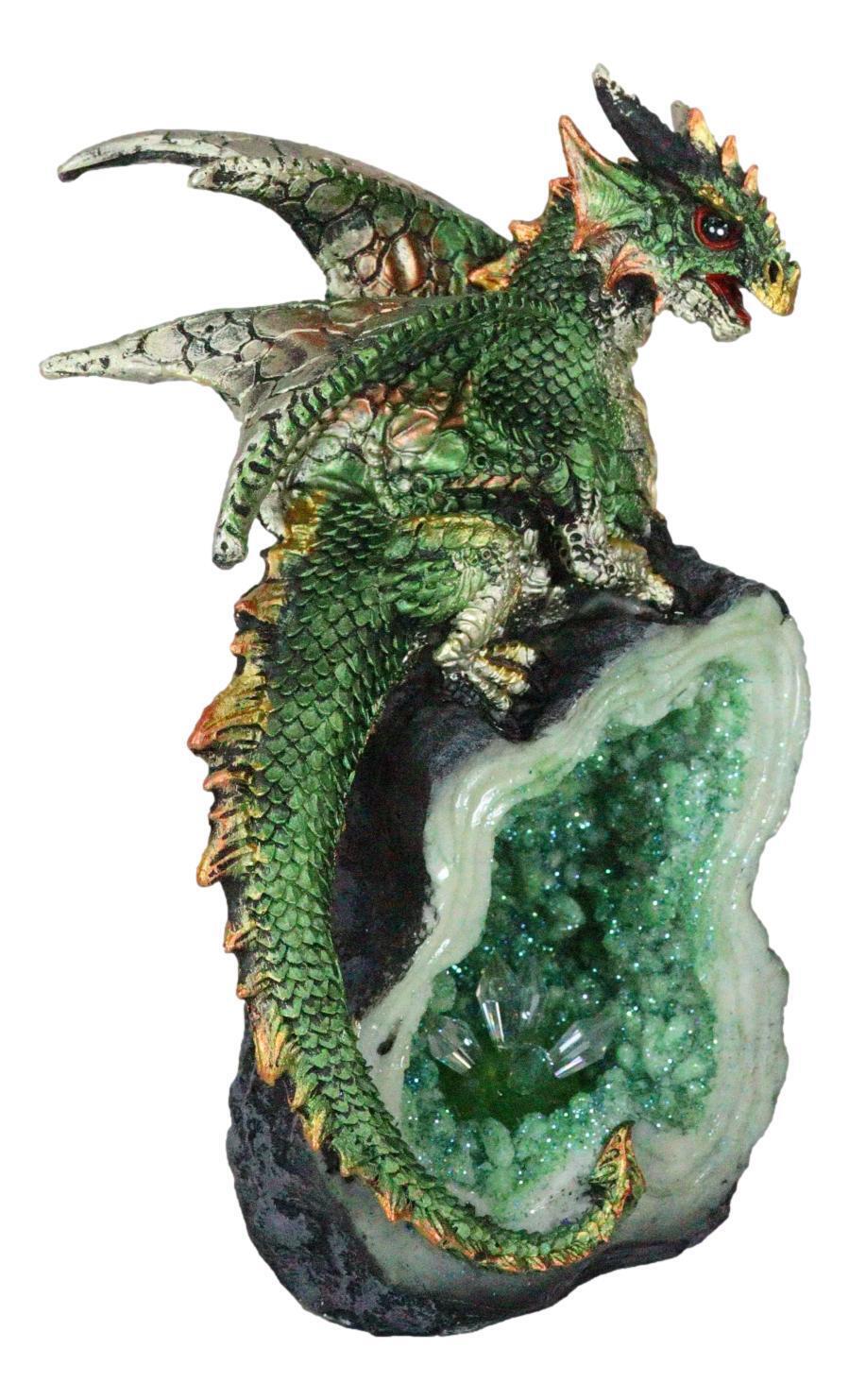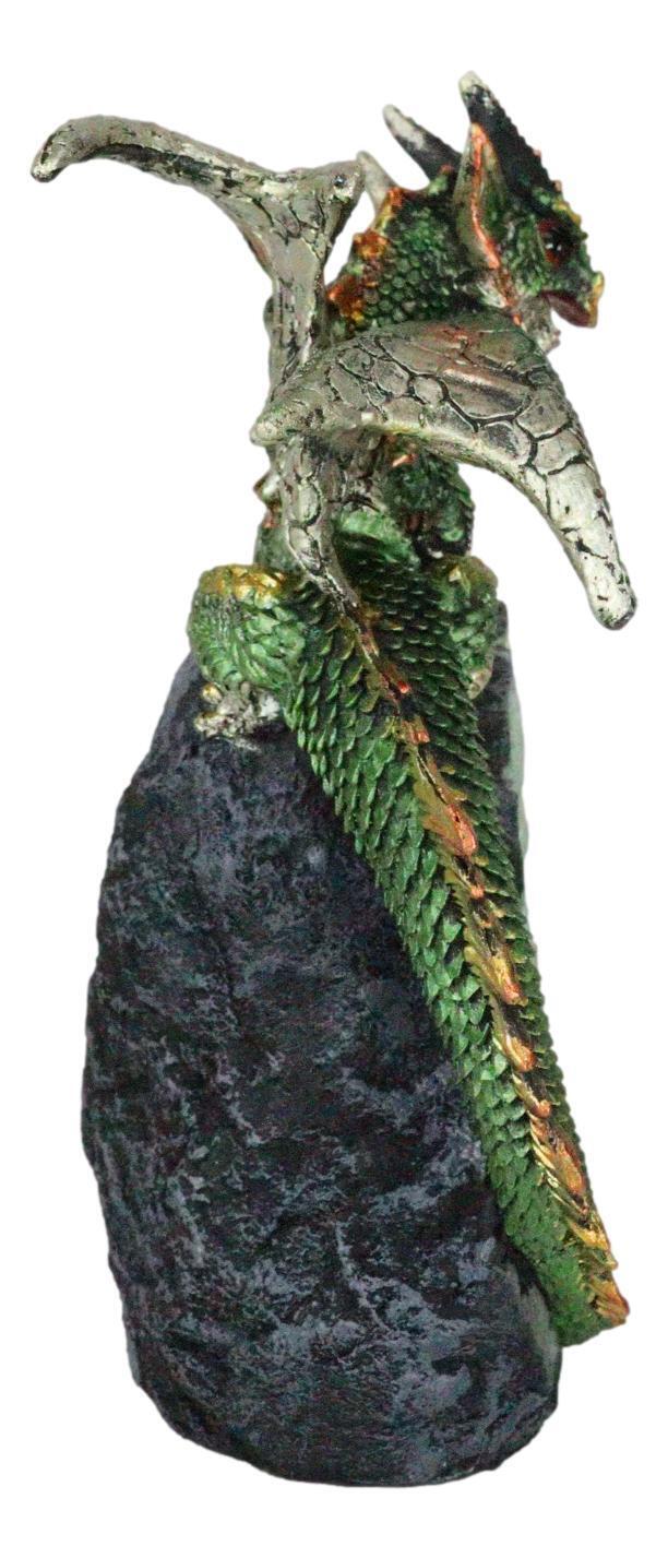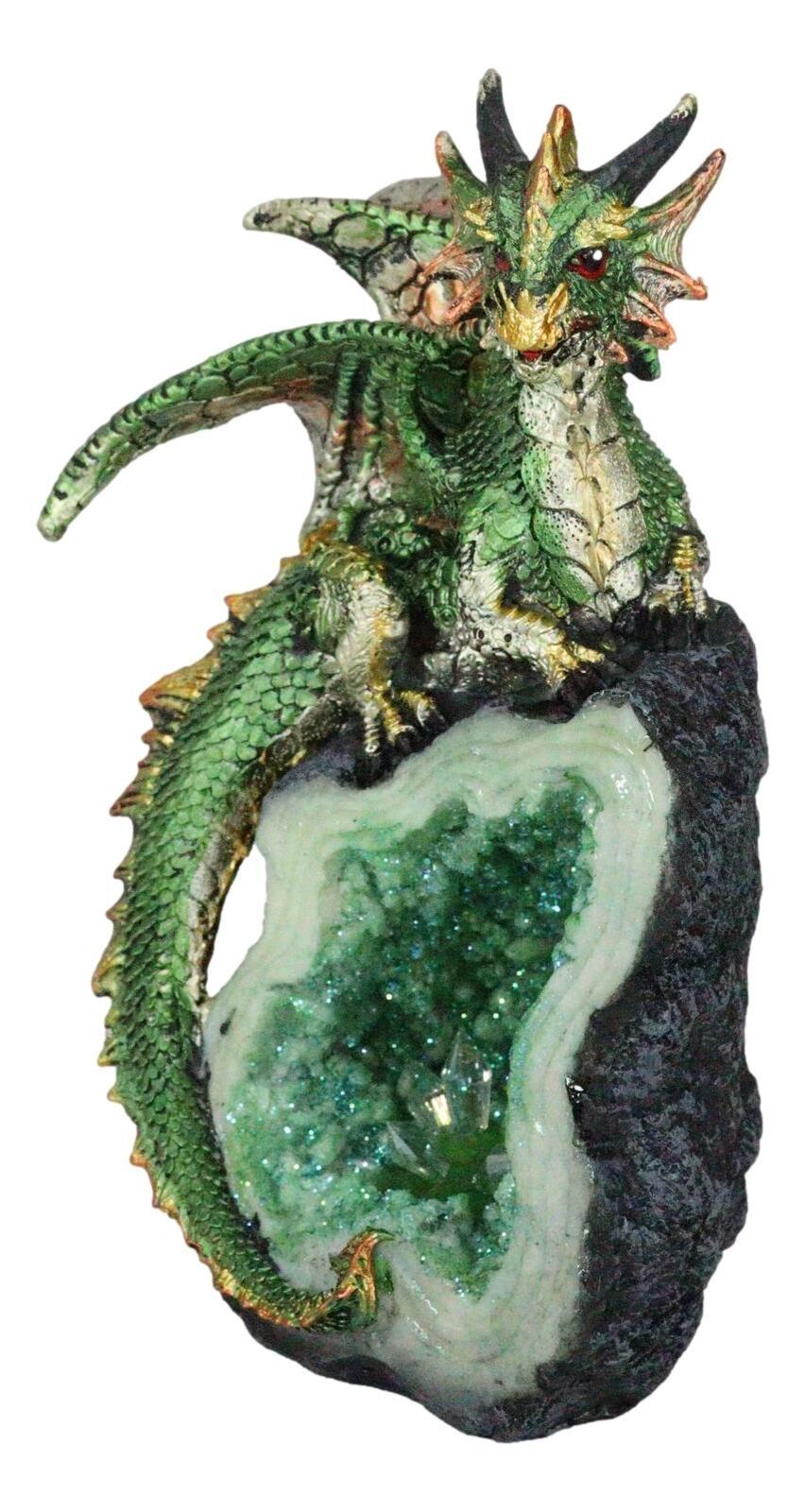 Metallic Green Iridescent Dragon On Faux Geode Rock Quartz Crystal Cove Figurine