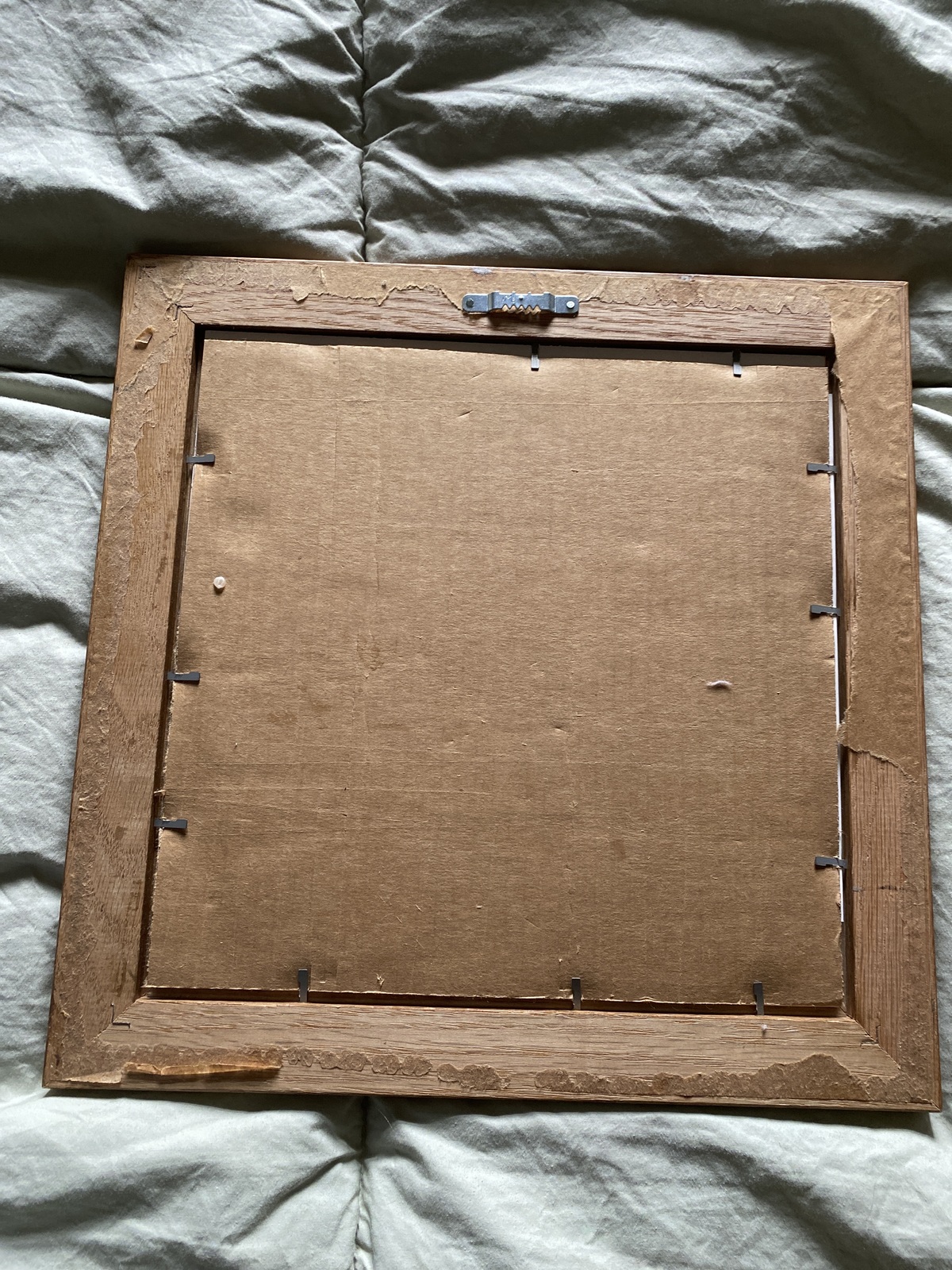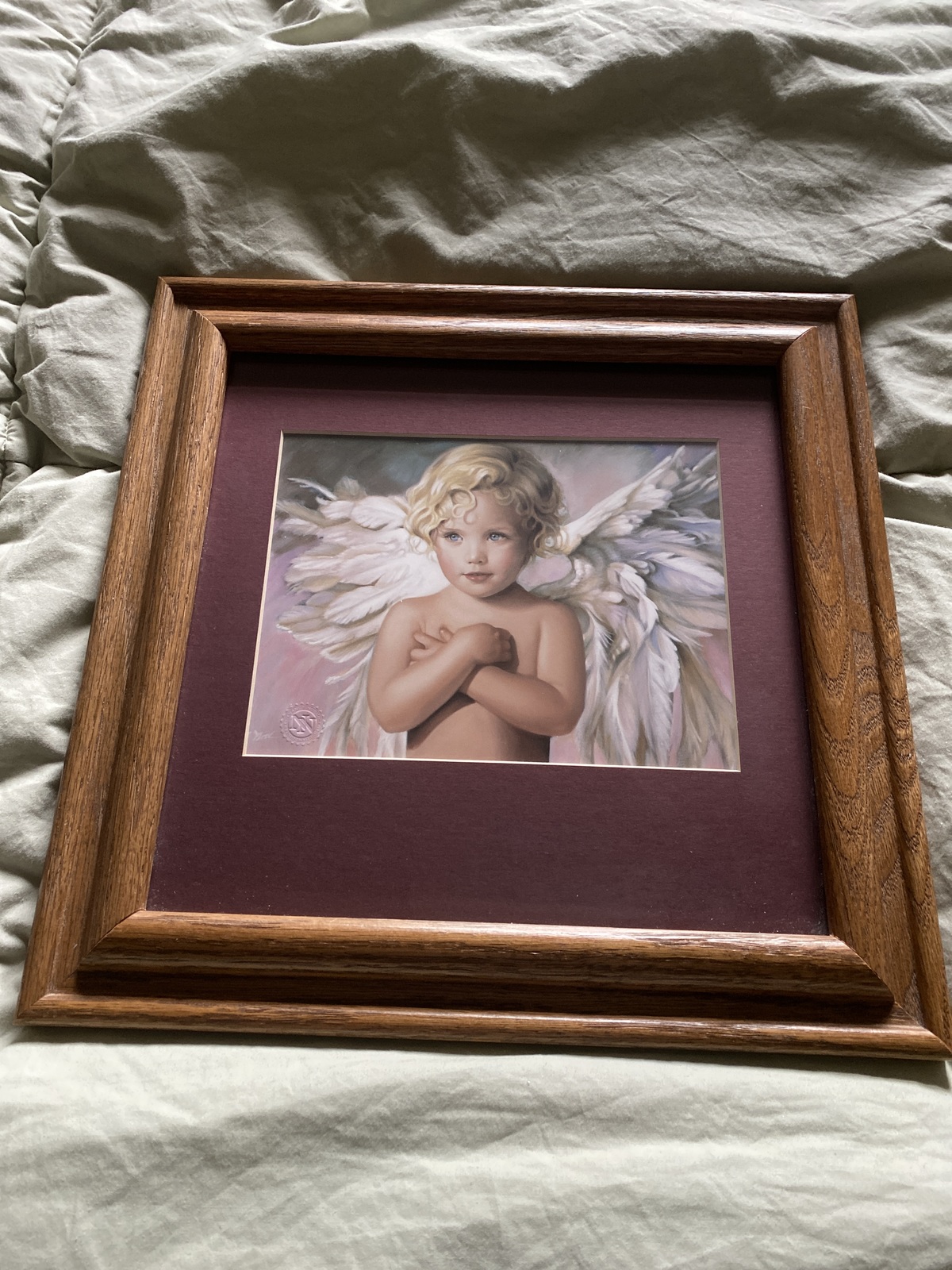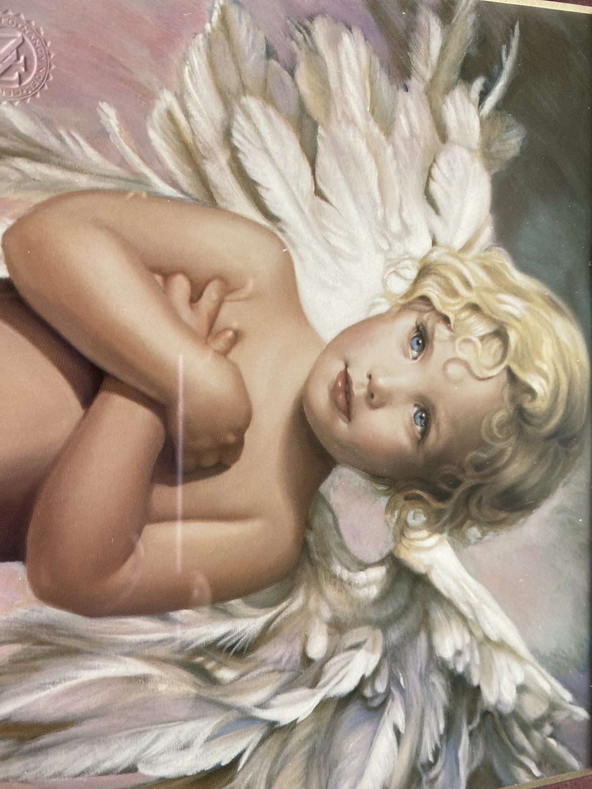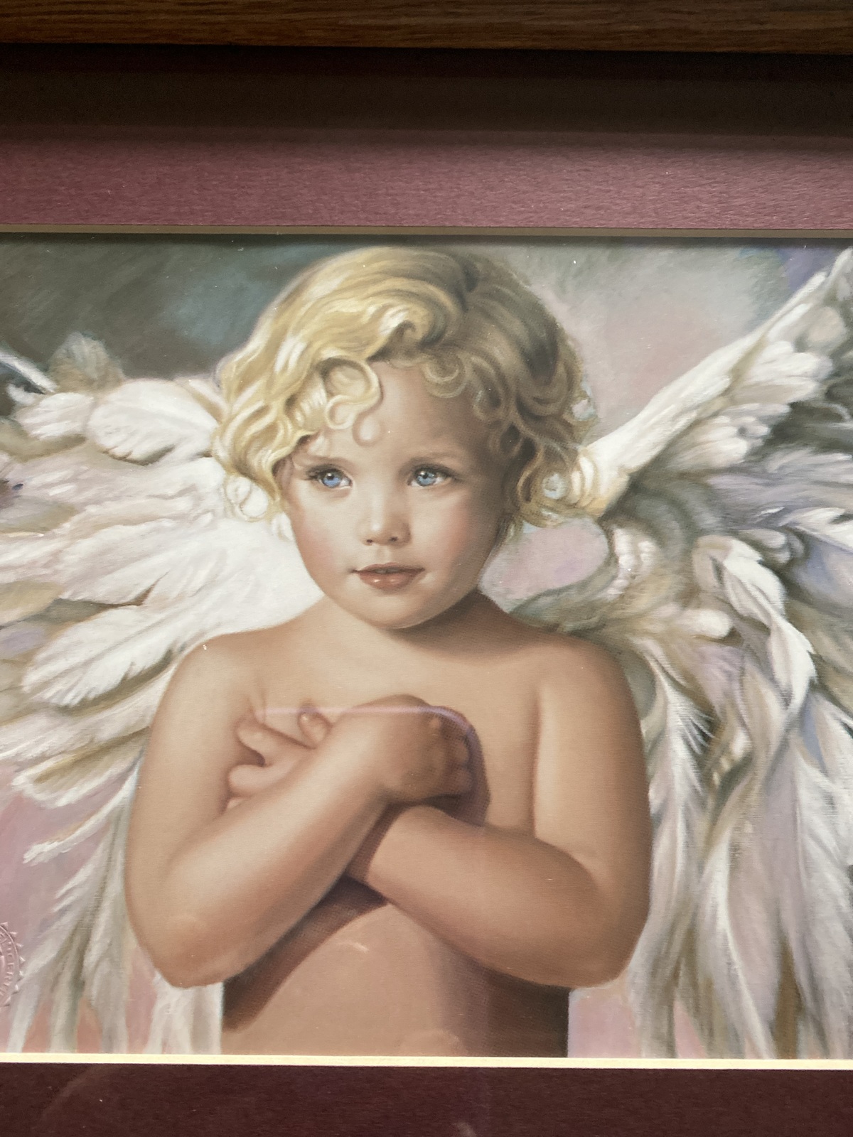 Stamped and signed in oak wood frame with glass front. Deep maroon border trim. Beautiful angel child picture.