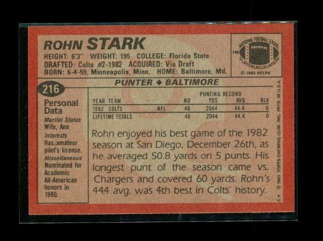 Vintage 1983 TOPPS Football Trading Card #216 ROHN STARK Baltimore Colts
