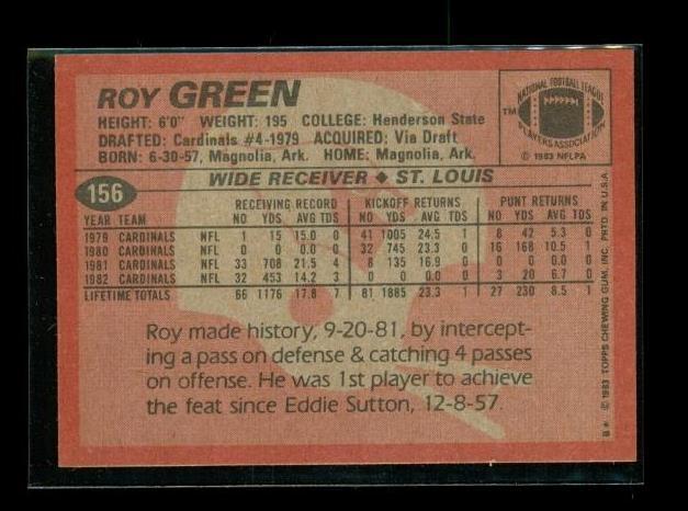 Vintage 1983 TOPPS Football Trading Card #156 ROY GREEN St. Louis Cardinals