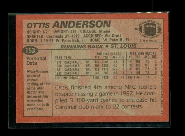 Vintage 1983 TOPPS Football Trading Card #153 OTTIS ANDERSON St Louis Cardinals