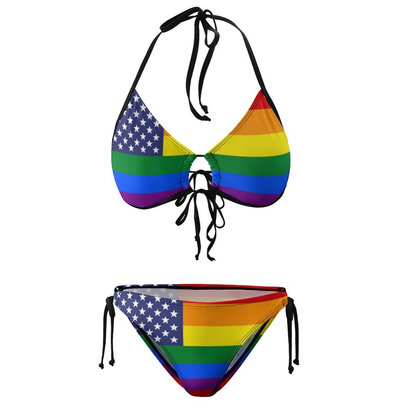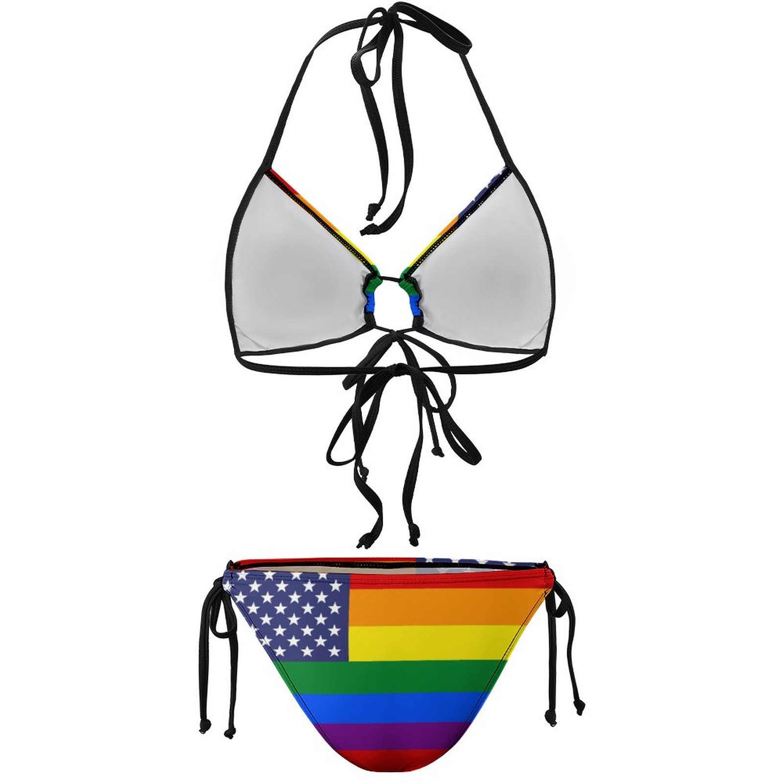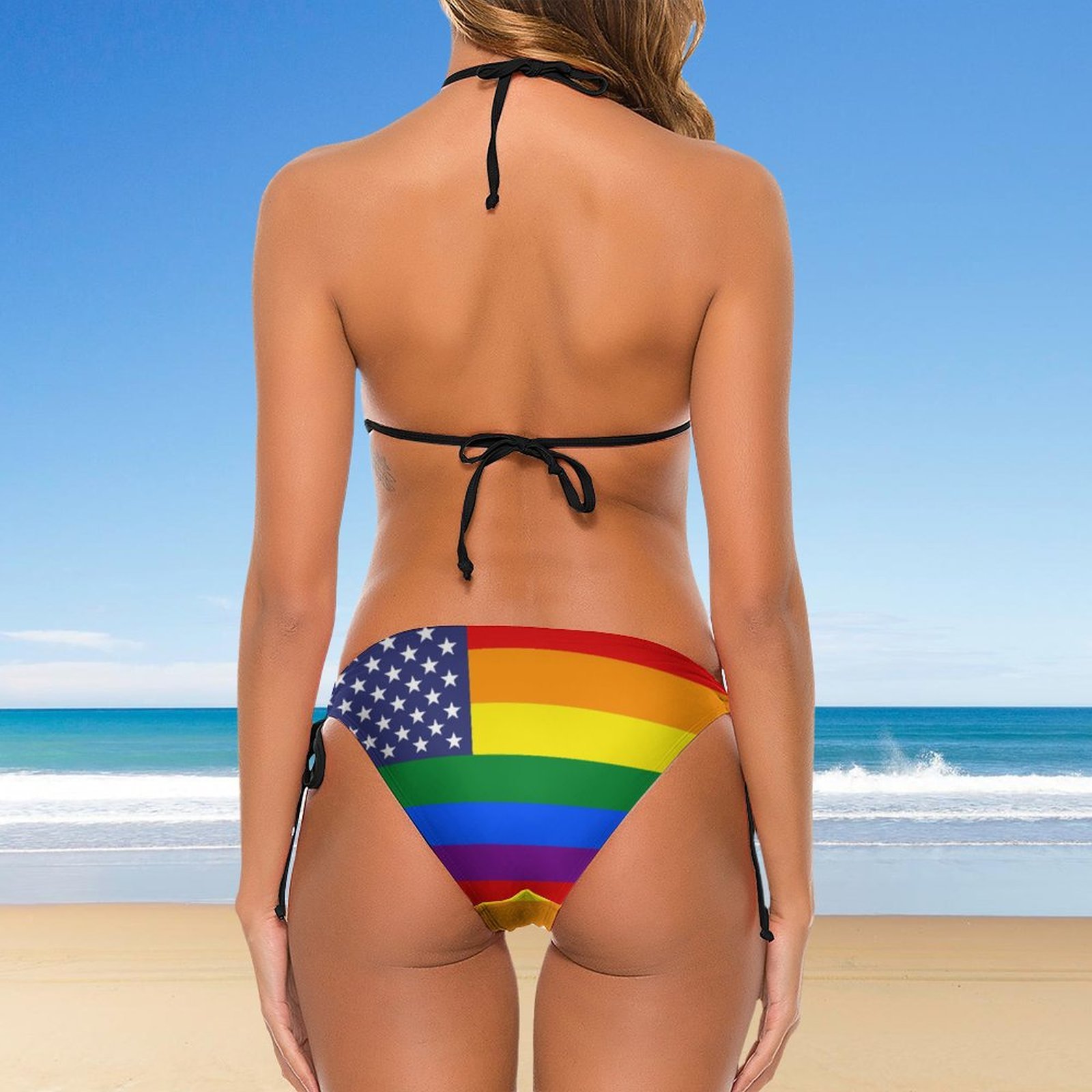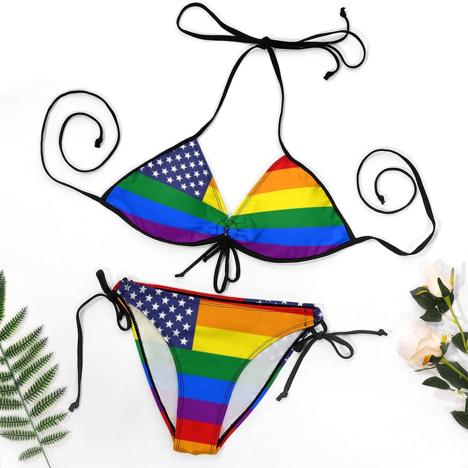 Rainbow American Flag gay pride low colorful stars and striped rise bikini swimsuit for women swimwear set summer beach.