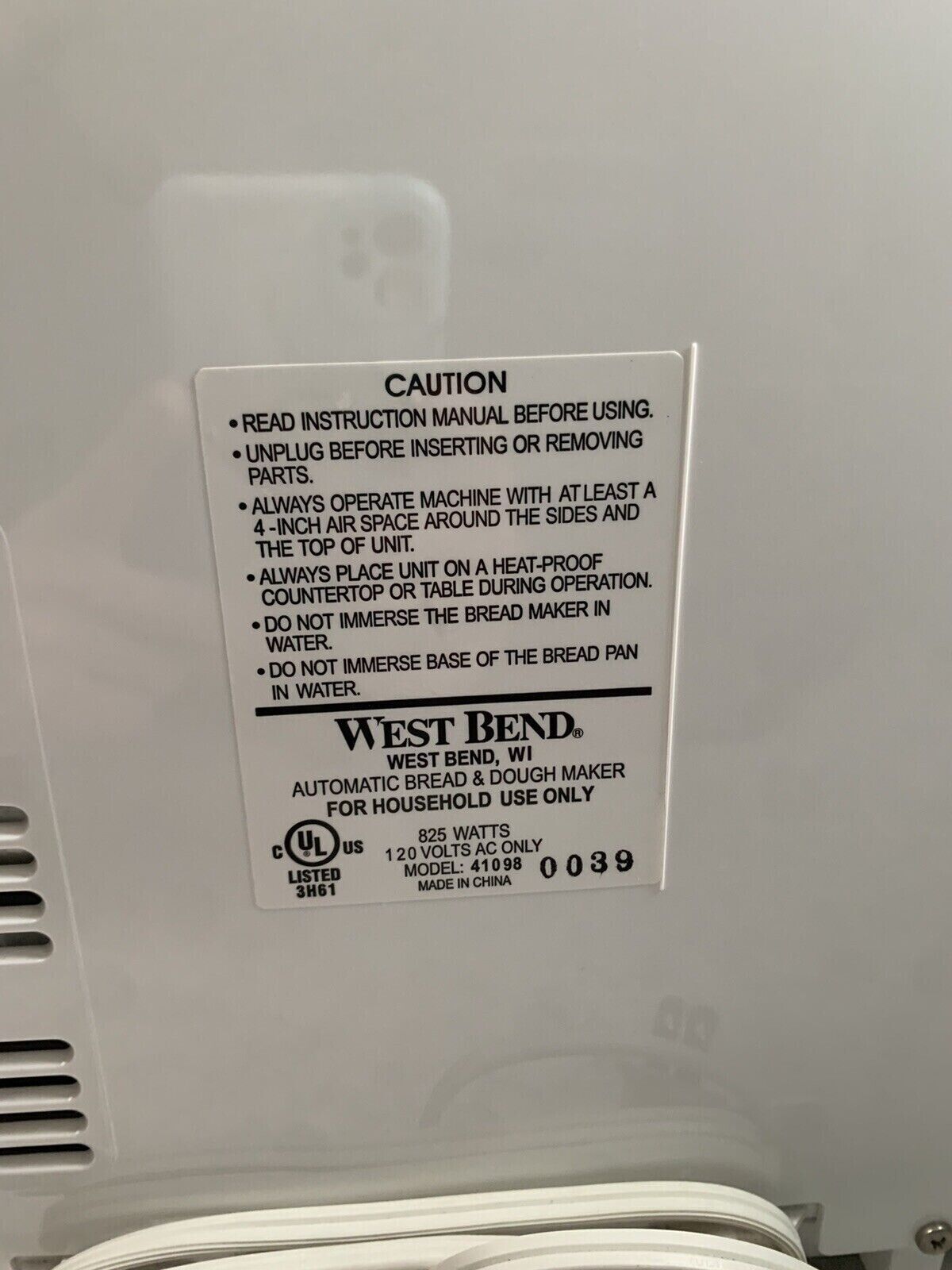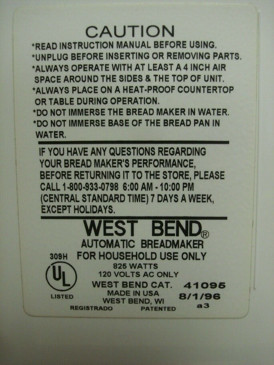 For West Bend Bread Maker Models 41095 41098 41099 |