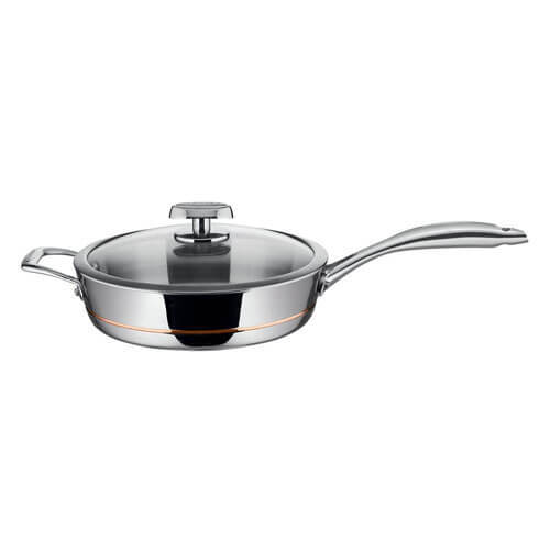 Cooking with Scanpan Axis makes it even easier with the performance of copper and the convenience of stainless steel. The exclusive 5 Layer/3 Ply construction has copper at its core, ensuring an even heat distribution. This 26cm Saute Pan has sealed edges to eliminate aluminium exposure, professional-quality Stainless Steel body enveloping a copper core to ensure no hot spots. Dome glass lid for easy viewing, permanently secured handle for strength and hygiene, inside satin finish with capacity markings for accurate cooking results. Compatible with all energy sources, including the efficiency of the latest cookware technology induction. Ergonomic riveted handle. Dome Tempered Glass Lid. Maintenance and care: Wash in hot soapy water before use. Do not use harsh scourers. Never put cold water into a hot pan. Avoid the use of excessive-high heat. Remove all food fat and residue from cookware. Never use oven cleaner. Whilst dishwasher safe Scanpan recommends handwashing to extend the us