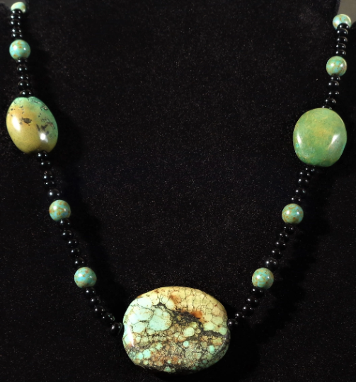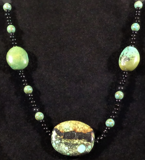 What an absolutely beautiful and completely unique Turquoise and black glass beaded necklace. The highly unusual Turquoise in this necklace has a total combined weight of 31 grams. Turquoise Carat weight is measured by multiplying each gram times 5.