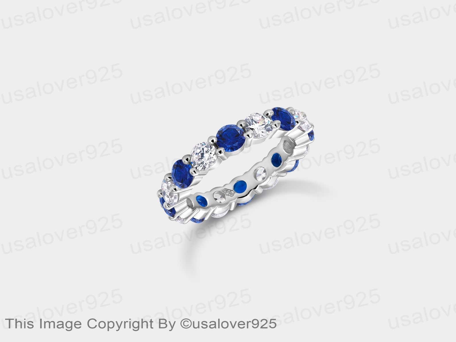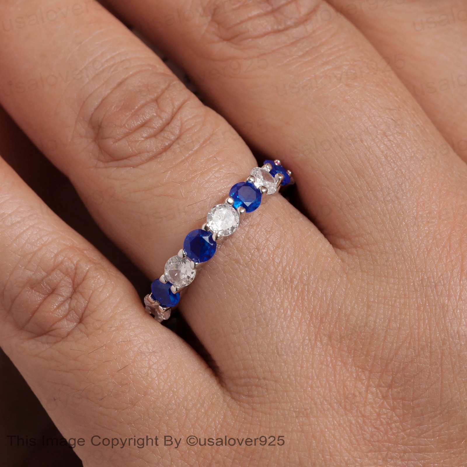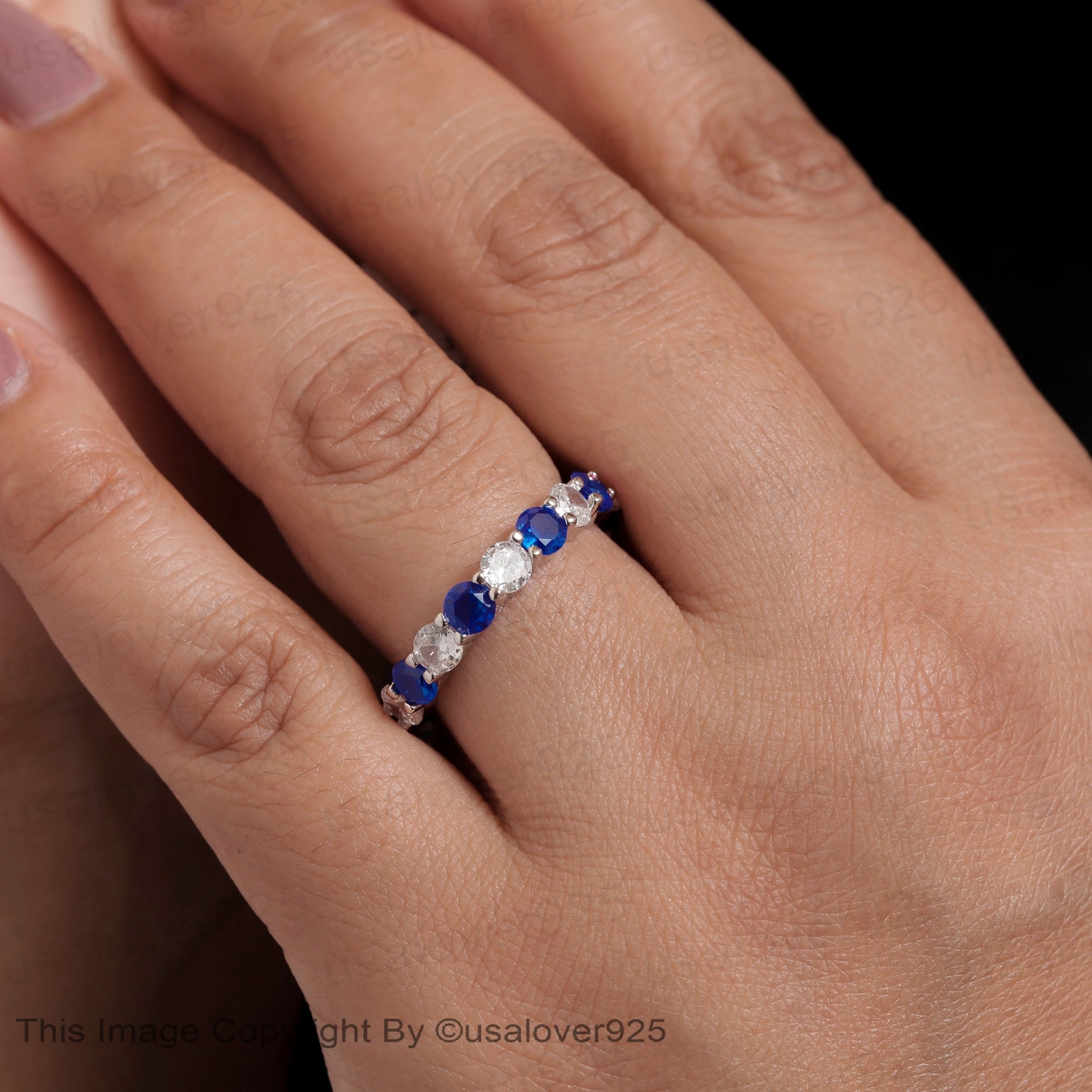 Sapphire And CZ Diamond Stone Sterling Silver Full Eternity Women Band Ring