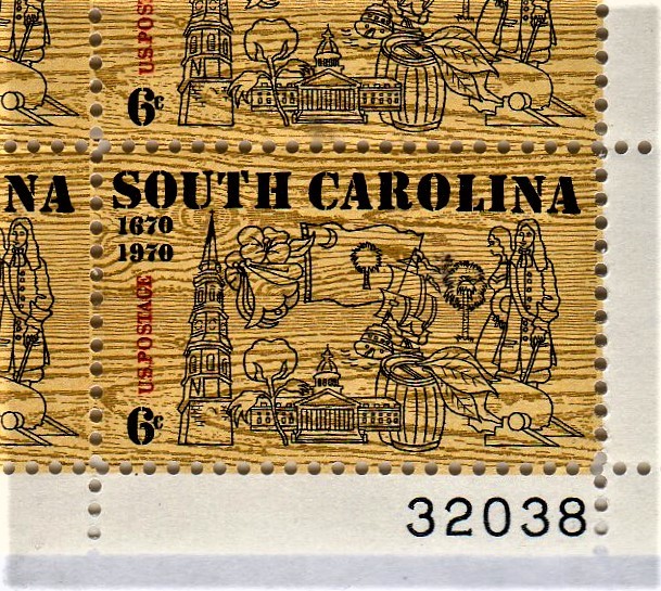 U S Stamp - South Carolina 1670 - 1970, 300 Years 6 Cent Plate Block of 4 Stamp