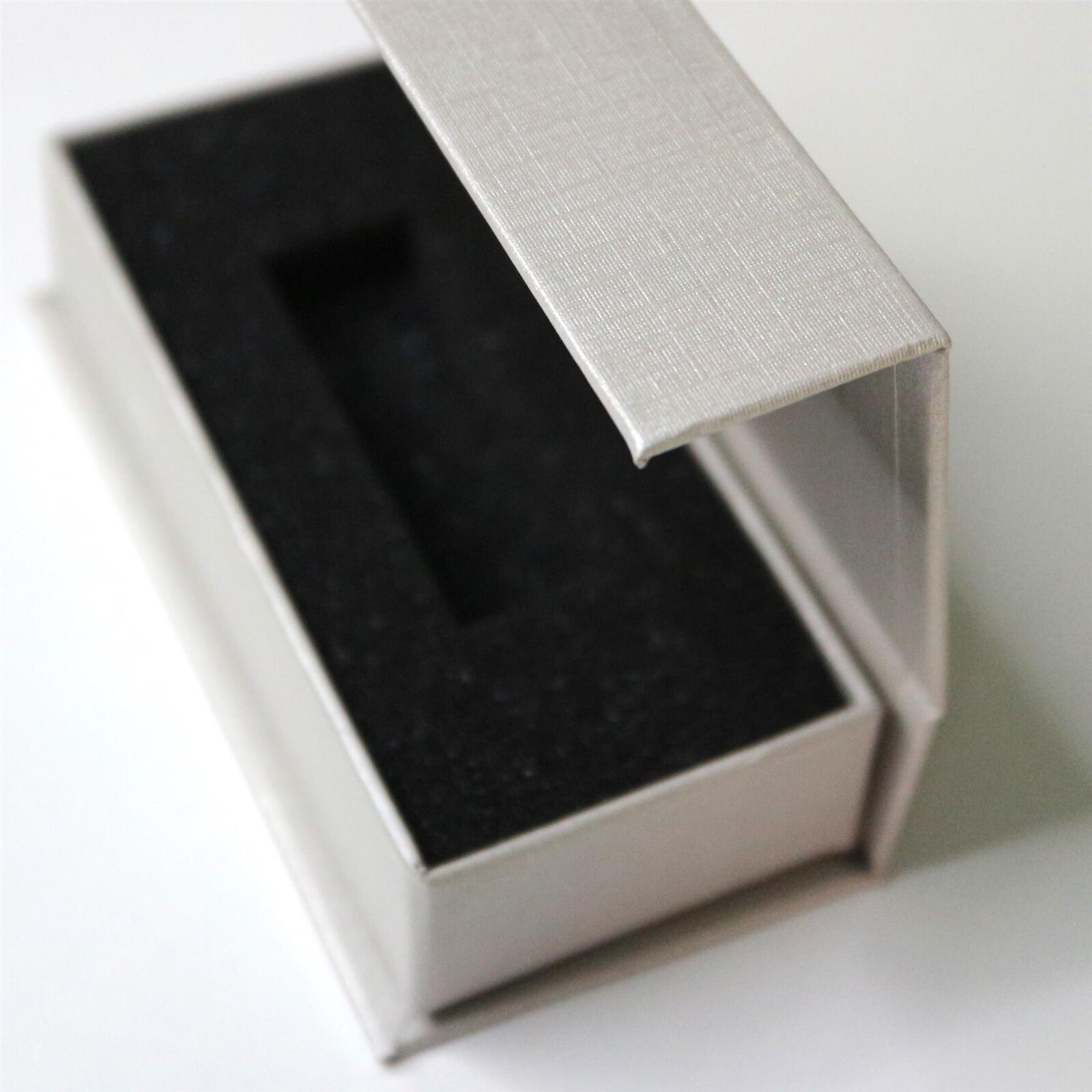 Un simple aimant cache dans la partie avant du couvercle assure la fermeture de la boîte USB lorsqu'elle n'est pas utilisee. La boîte parfaite pour presenter vos images, documents ou videos numeriques.