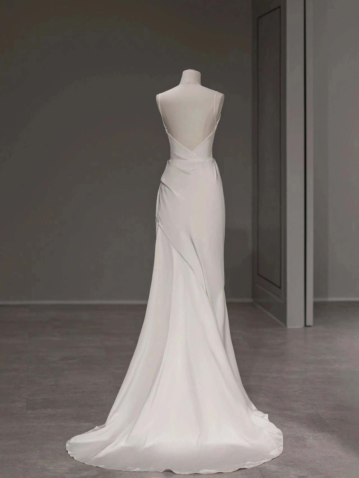 Elegant Spaghetti Straps Sheath Simple Silk Satin Wedding Dress Floor Length