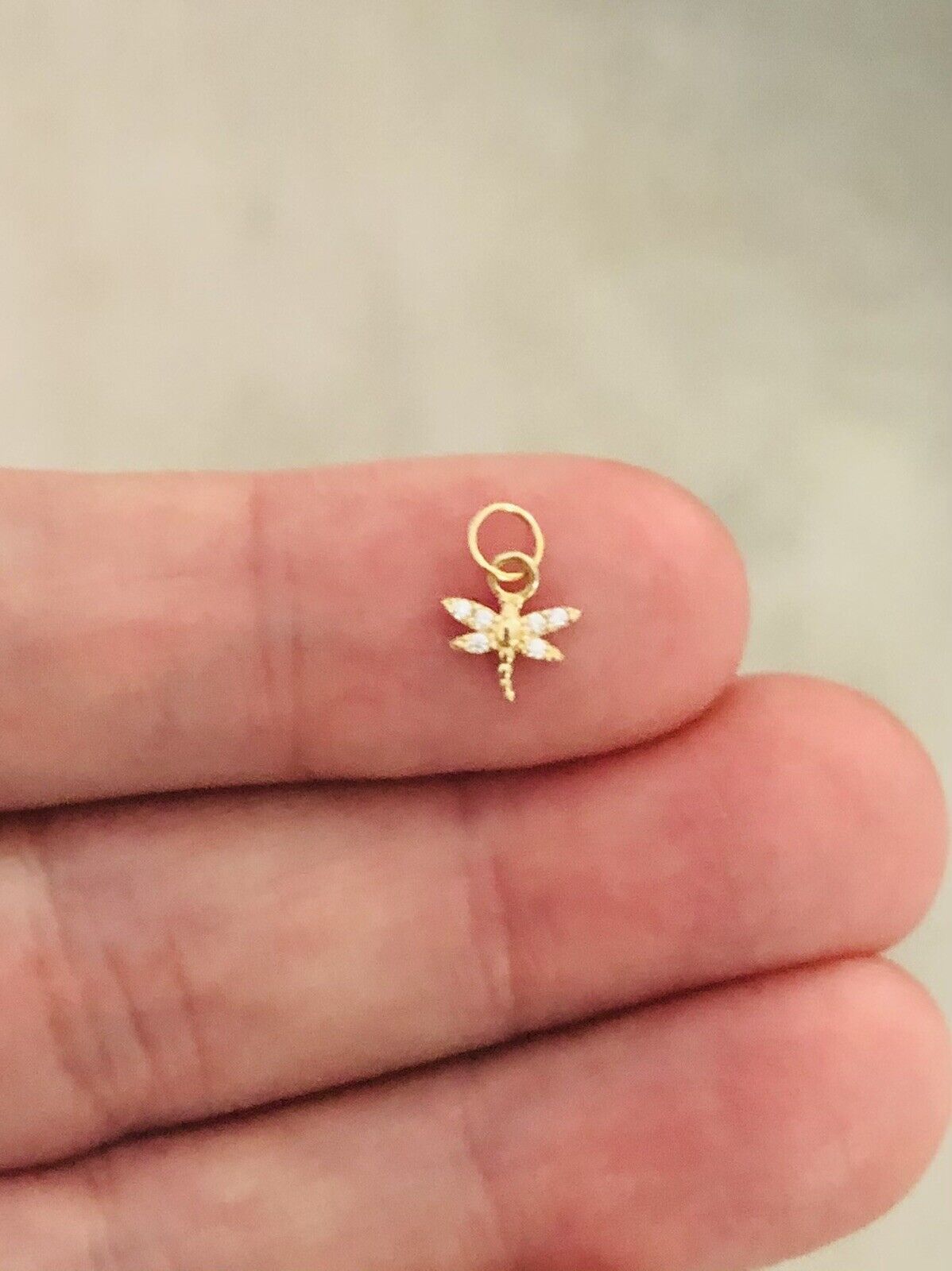 14k Yellow Gold cubic zirconia Tiny Dragonfly Charm Pendant.