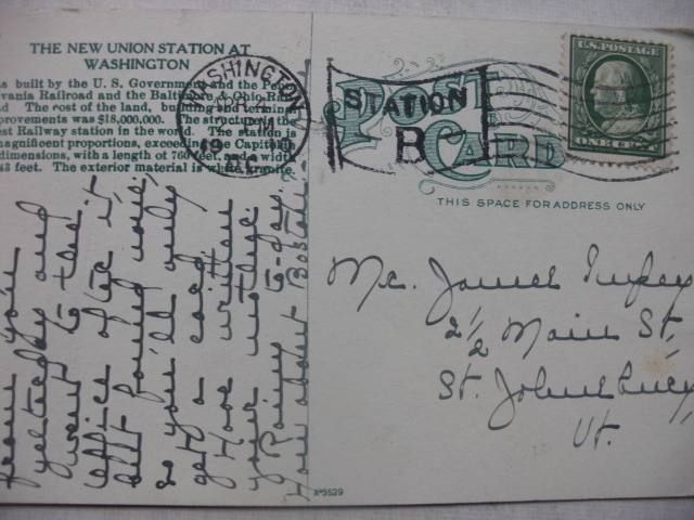 . Vintage Post Card of: “Union Station, Washington, D.C.” Published by Lipsher Specialty Co., New Orleans, VA. ON the back description of The “New Union Station at Washington” post marked 1910. A green George Washington One Cent stamp is affixed to the back
