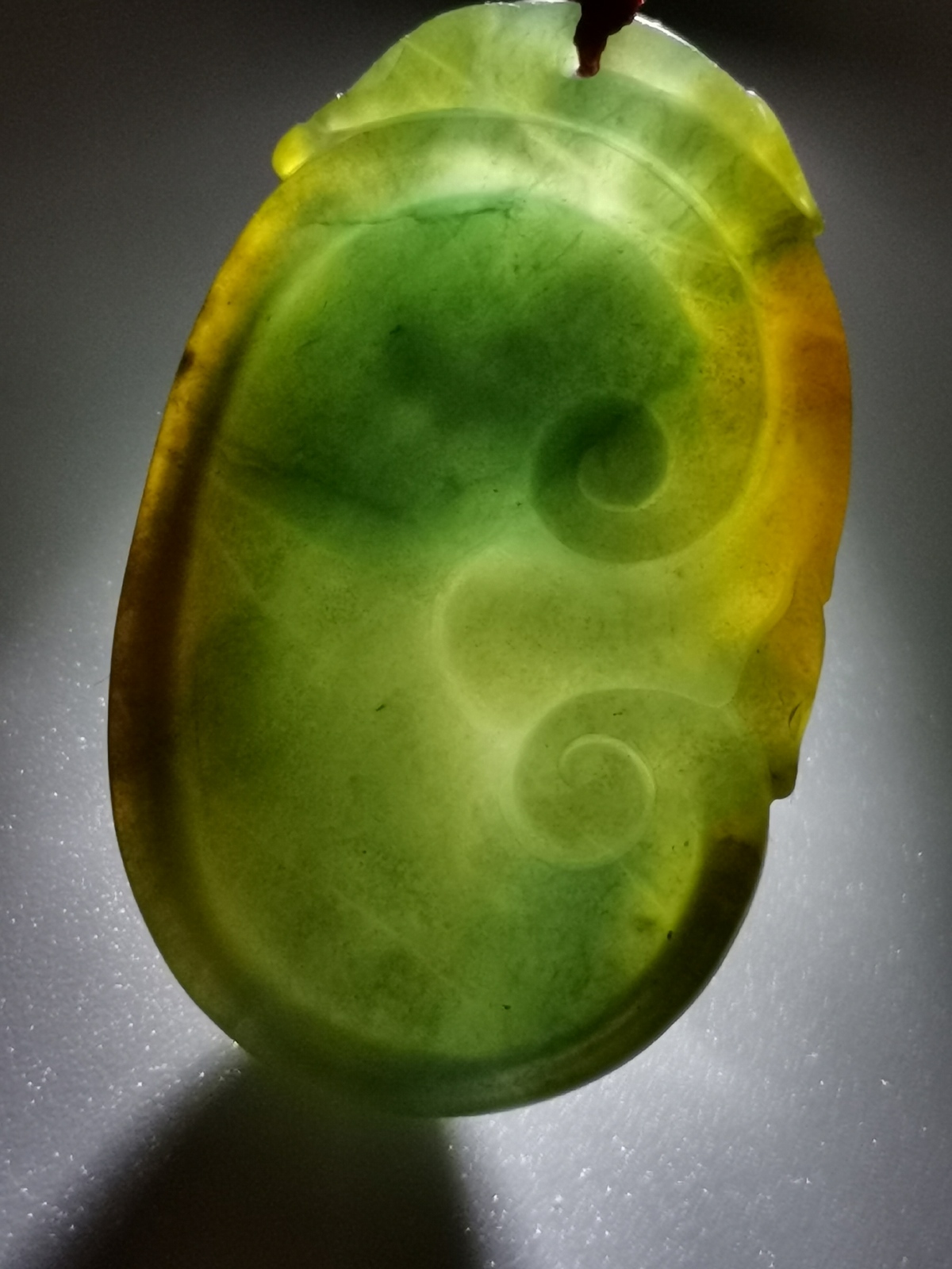 This is a natural Burmese jadeite pendant, carved from a high-quality yellow-green variety, which is extremely rare. The jadeite was originally sourced as a piece of icy yellow-green jadeite, and was expertly crafted into an exquisite Ruyi-shaped pendant. The pendant comes with certification of authenticity (A-grade natural jadeite) and measures approximately 39.10mm x 23.90mm x 6.60mm, with a weight of 13.48 grams and a carat weight of 67.40 carats. The rarity of this particular variety of jadeite is exceptional, making it an extremely valuable addition to any collection. The delicacy and intricate detail of the carving further enhances its beauty and desirability, while the Ruyi shape of the pendant carries a significant meaning in Chinese culture, symbolizing good luck, prosperity, and the granting of wishes. Overall, this natural Burmese jadeite pendant is a truly exceptional piece, combining exceptional rarity, expert craftsmanship, and deep cultural significance. Its value as a collectible is beyond measure, and it is sure to become a treasured addition to any serious collector's collection.