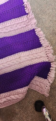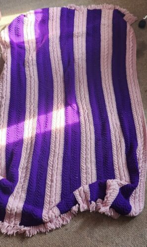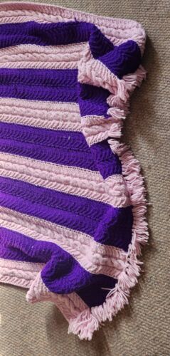 Beautiful vintage handmade custom label afghan. Purple and pink. Measures 56 inches wide. 72 inches long not counting the fringe on the ends.