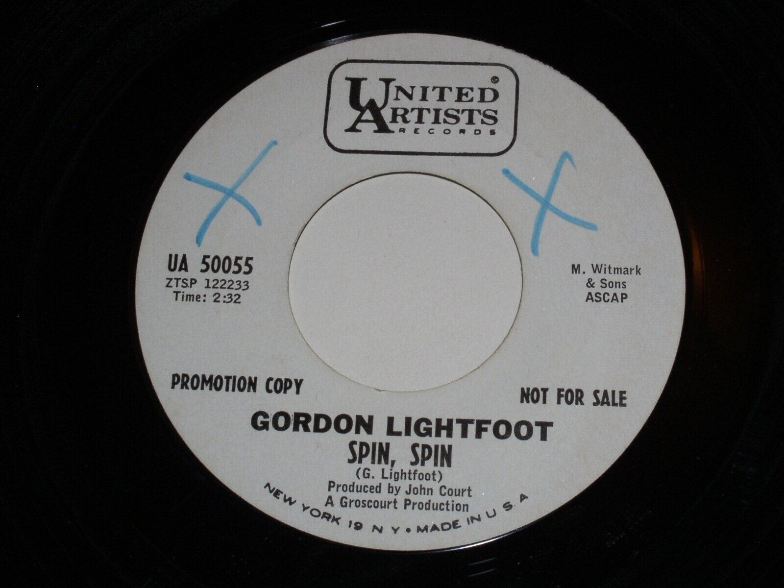 This is a vintage, promotional 45 rpm phonograph record by Gordon Lightfoot, entitled, "Spin Spin". Flipside: "For Lovin' Me". Record label: United Artists UA 50055.