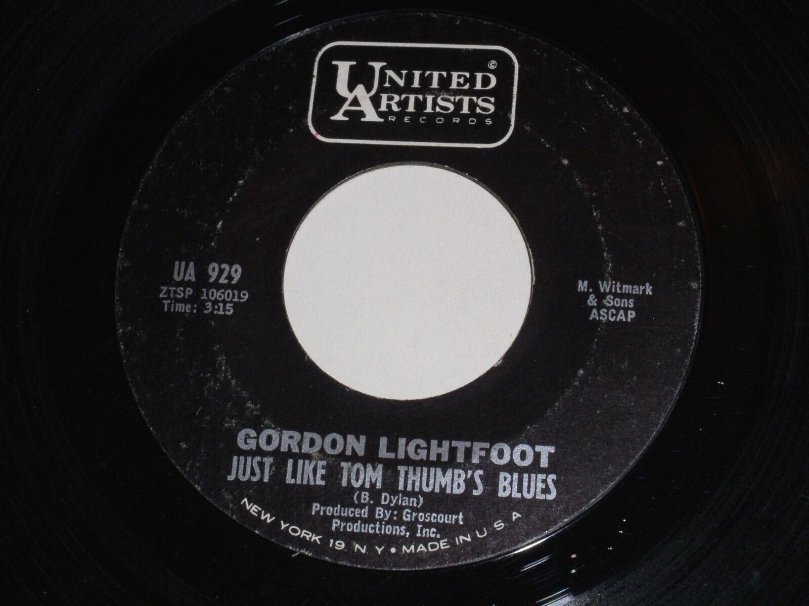 This is a vintage 45 rpm phonograph record by Gordon Lightfoot, entitled, "Just Like Tom Thumb's Blues". Flipside: "Ribbon Of Darkenss". Record label: United Artists UA 929.