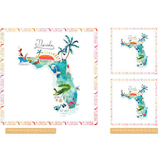 24" X 44" Panel Florida State Map Cities Palm Trees Animals Sunset Tropical Sara Franklin White Cotton Fabric Panel (51140P-X)